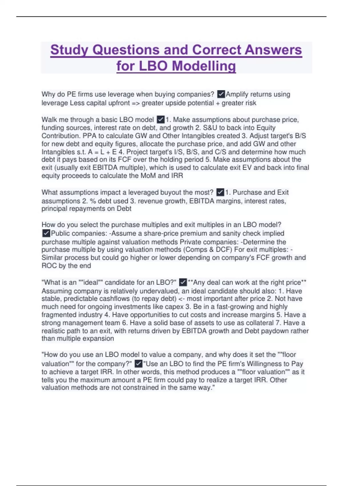 Study Questions and Correct Answers for LBO Modelling