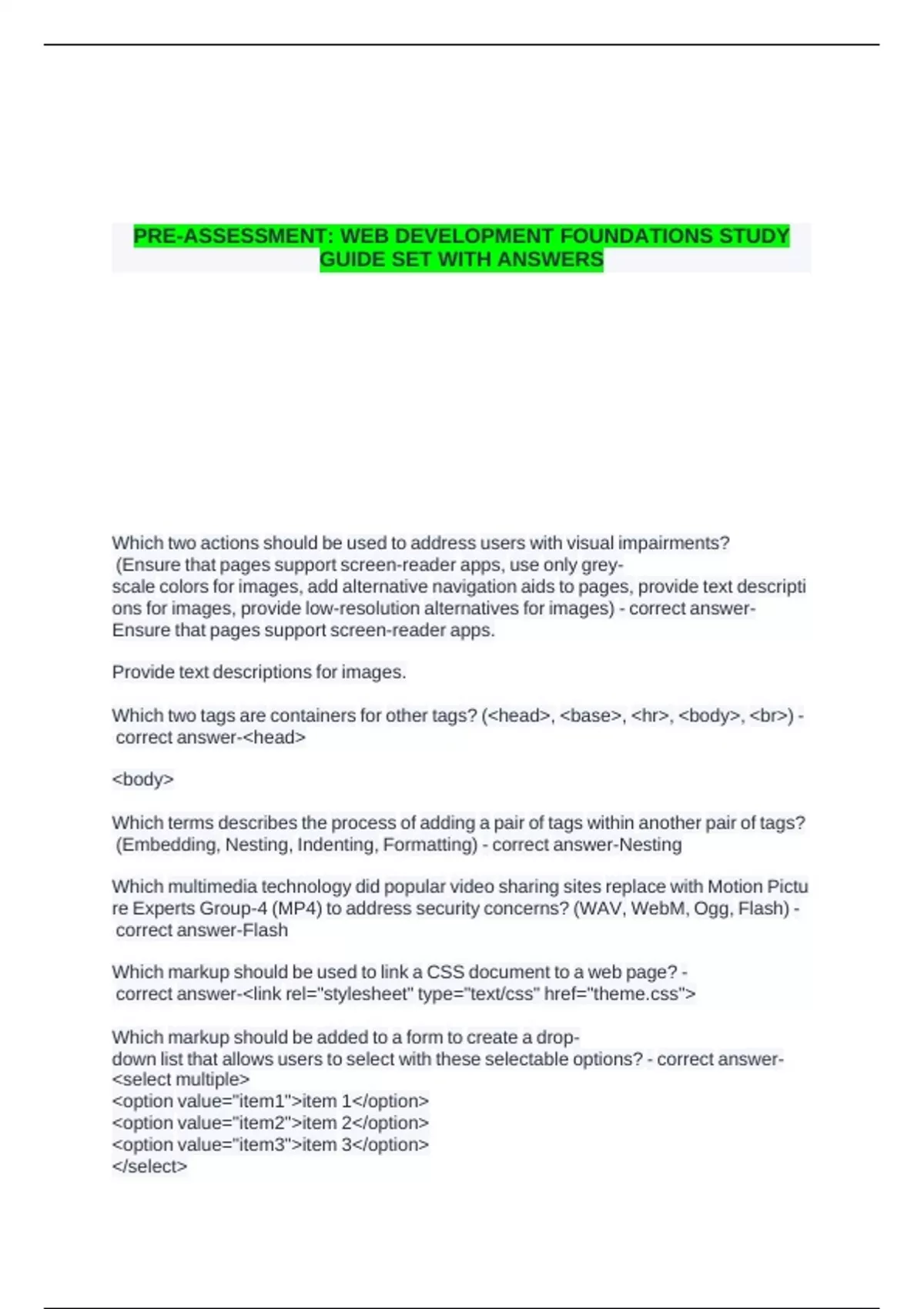 PRE-ASSESSMENT: WEB DEVELOPMENT FOUNDATIONS STUDY GUIDE SET WITH ANSWERS