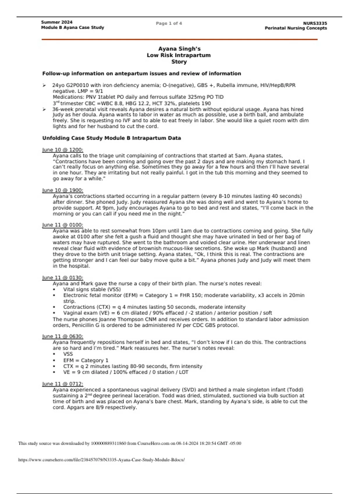 Module B Ayana Case Study Perinatal Nursing Concepts