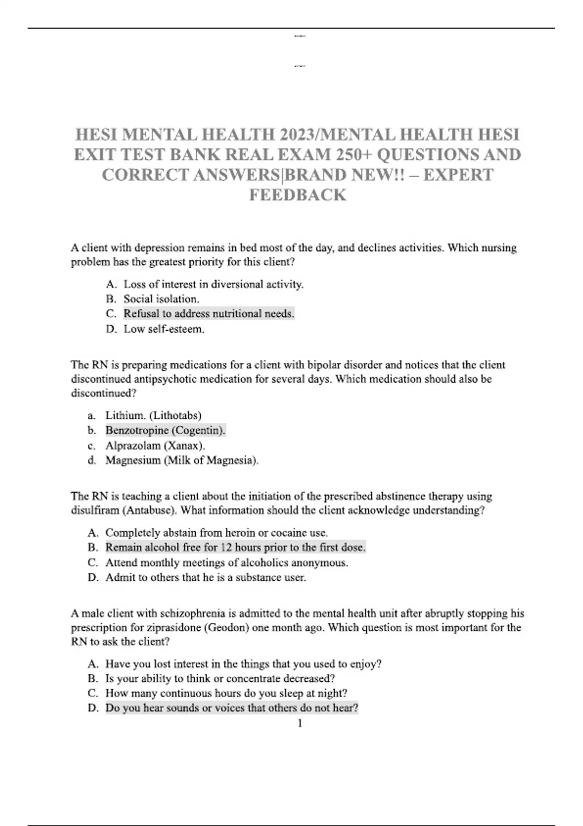 HESI MENTAL HEALTH MENTAL HEALTH HESI EXIT TEST BANK REAL EXAM 250+ QUESTIONS AND CORRECT ANSWERS-BRAND NEW!! – EXPERT FEEDBACK