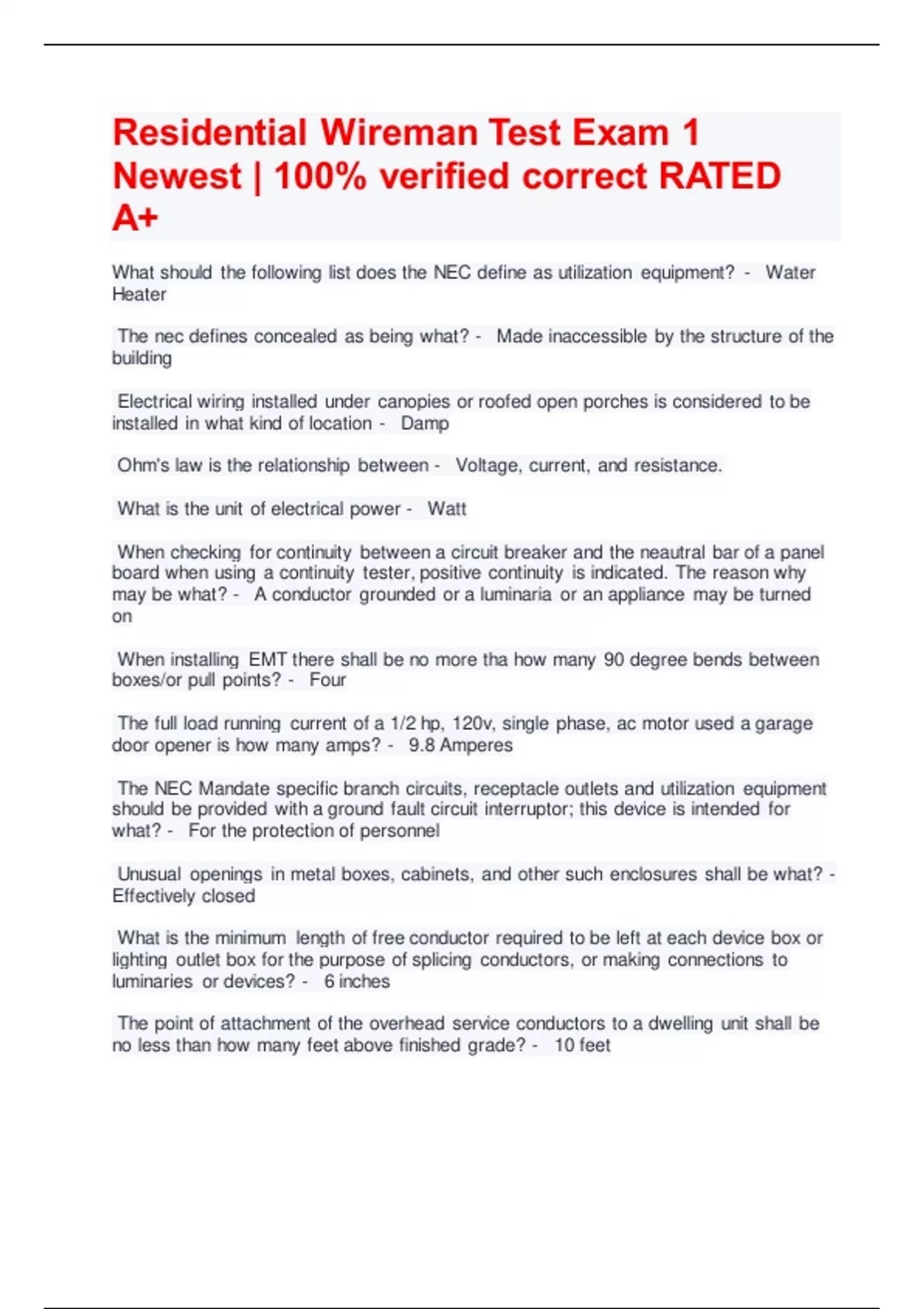 Residential Wireman Test Exam 1 Newest | 100% verified correct RATED A+