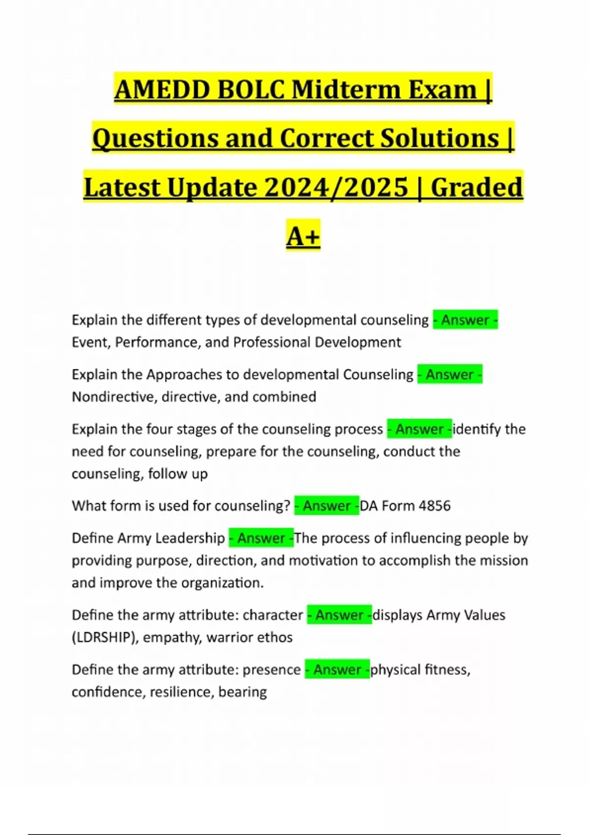 AMEDD BOLC Midterm Exam | Questions and Correct Solutions | Latest Update 2024/2025 | Graded A+ Explain the different types of developmental counseling - Answer - Event, Performance, and Professional Development Explain the Approaches to developmental Counseling - Answer - Nondirective, directive, and combined Explain the four stages of the counseling process - Answer -identify the need for counseling, prepare for the counseling, conduct the counseling, follow up What form is used for counseling? - Answer -DA Form 4856 Define Army Leadership - Answer -The process of influencing people by providing purpose, direction, and motivation to accomplish the mission and improve the organization. Define the army attribute: character - Answer -displays Army Values (LDRSHIP), empathy, warrior ethos Define the army attribute: presence - Answer -physical fitness, confidence, resilience, bearingDefine the army attribute: intellect - Answer -sound judgement, mental agility, innovation, expertise Define the army competencies: leads - Answer -builds trust, leads by example, communicates Define the army competencies: develops - A