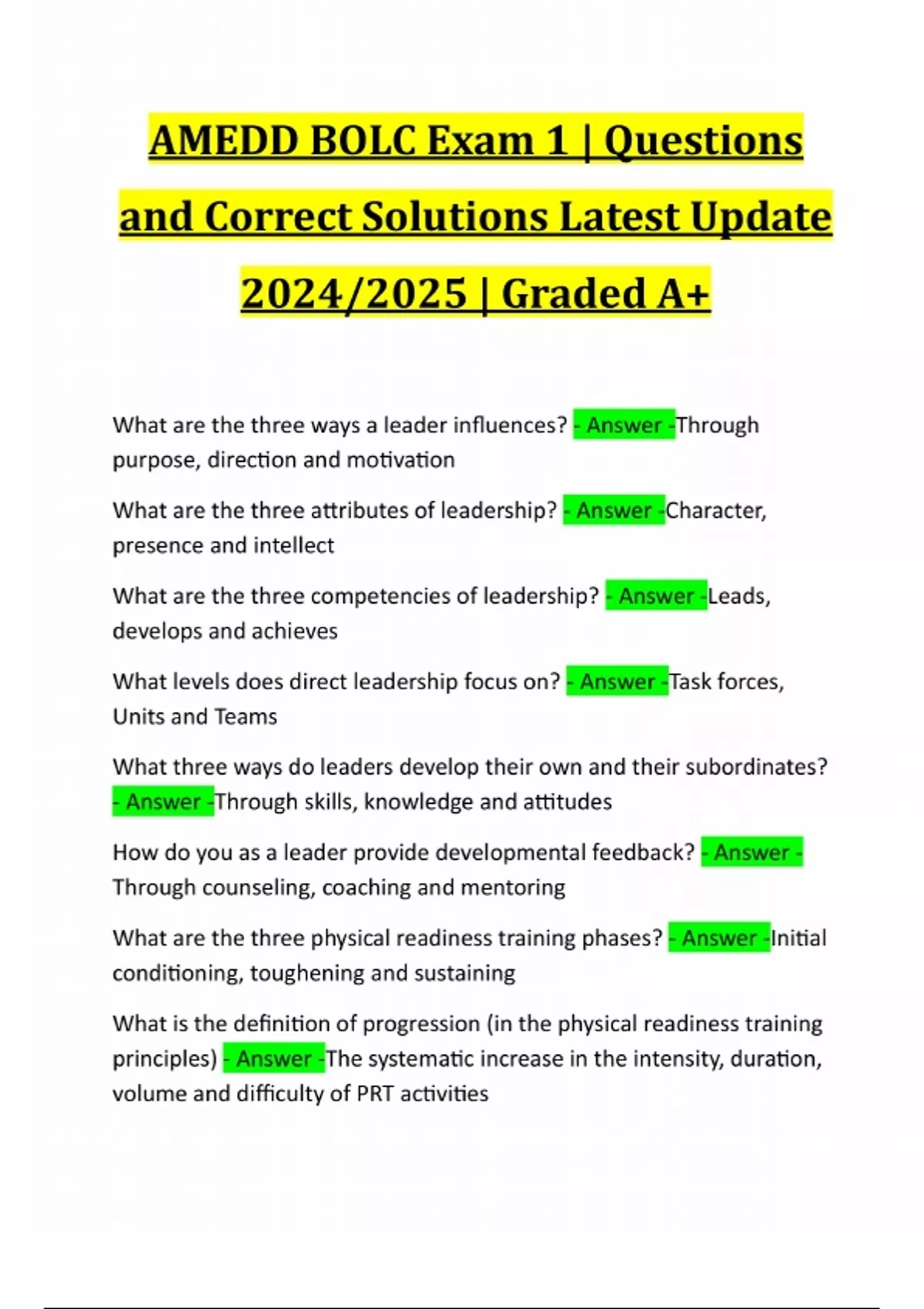 AMEDD BOLC Exam 1 | Questions and Correct Solutions Latest Update 2024/2025 | Graded A+ What are the three ways a leader influences? - Answer -Through purpose, direction and motivation What are the three attributes of leadership? - Answer -Character, presence and intellect What are the three competencies of leadership? - Answer -Leads, develops and achieves What levels does direct leadership focus on? - Answer -Task forces, Units and Teams What three ways do leaders develop their own and their subordinates? - Answer -Through skills, knowledge and attitudes How do you as a leader provide developmental feedback? - Answer - Through counseling, coaching and mentoring What are the three physical readiness training phases? - Answer -Initial conditioning, toughening and sustaining What is the definition of progression (in the physical readiness training principles) - Answer -The systematic increase in the intensity, duration, volume and difficulty of PRT activitiesWhat are the three components of Physical Readiness Training? - Answer -Strength, Mobility and Enduran