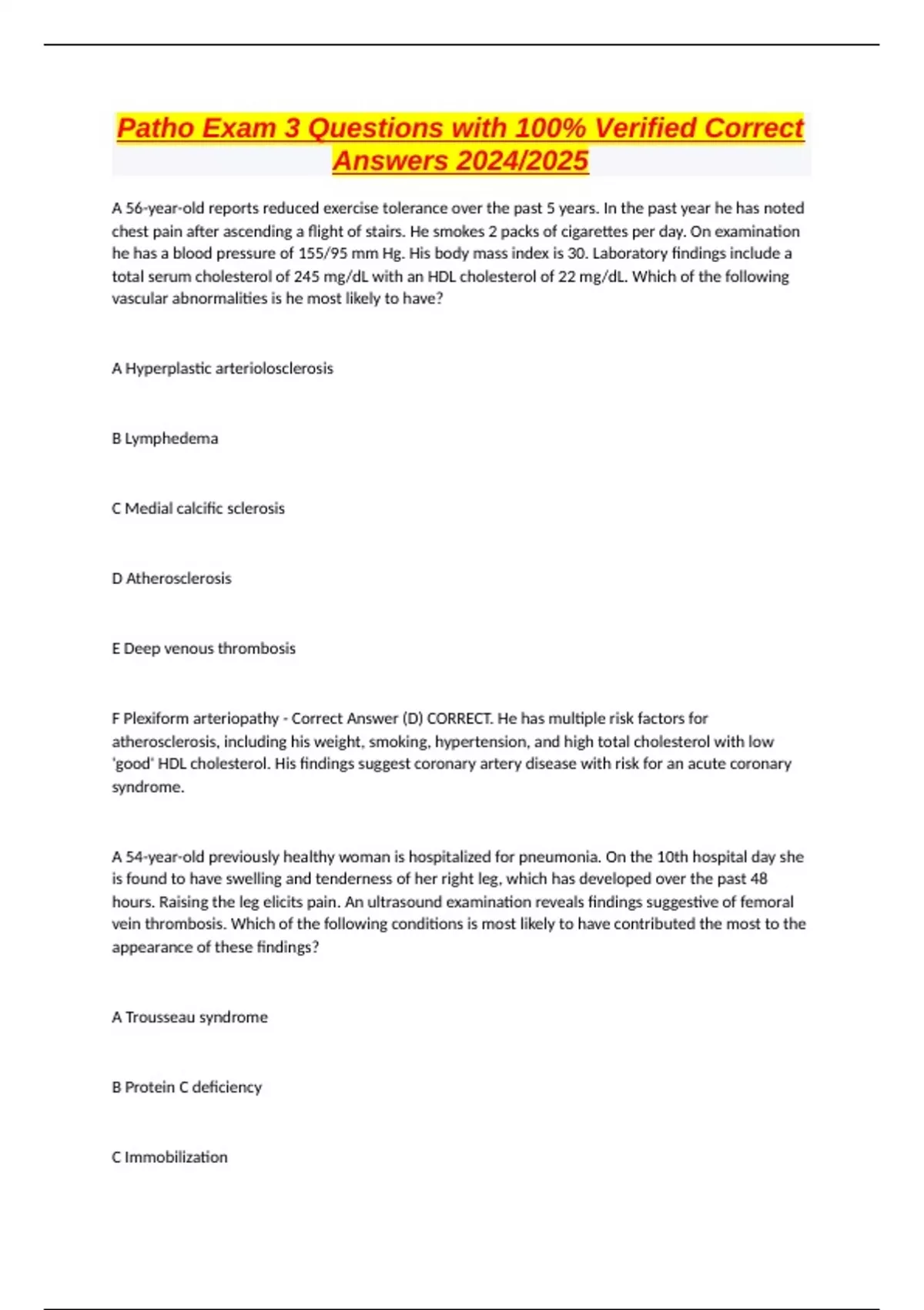Patho Exam 3 Questions with 100% Verified Correct Answers 2024/2025 A 56-year-old reports reduced exercise tolerance over the past 5 years. In the past year he has noted chest pain after ascending a flight of stairs. He smokes 2 packs of cigarettes per day. On examination he has a blood pressure of 155/95 mm Hg. His body mass index is 30. Laboratory findings include a total serum cholesterol of 245 mg/dL with an HDL cholesterol of 22 mg/dL. Which of the following vascular abnormalities is he most likely to have? A Hyperplastic arteriolosclerosis B Lymphedema C Medial calcific sclerosis D Atherosclerosis E Deep venous thrombosis F Plexiform arteriopathy - Correct Answer (D) CORRECT. He has multiple risk factors for atherosclerosis, including his weight, smoking, hypertension, and high total cholesterol with low 'good' HDL cholesterol. His findings suggest coronary artery disease with risk for an acute coronary syndrome. A 54-year-old previously healthy woman is hospitalized for pneumonia. On the 10th hospital day she is found to have swelling and tenderness of her right leg, which has developed over the past 48 hours. Raising the leg elicits pain. An ultrasound examination reveals findings suggestive of femoral vein thrombosis. Which of the following conditions is most likely to have contributed the most to the appearance of these findings? A Trousseau syndrome B Protein C deficiency C Immobilization D Pregnancy