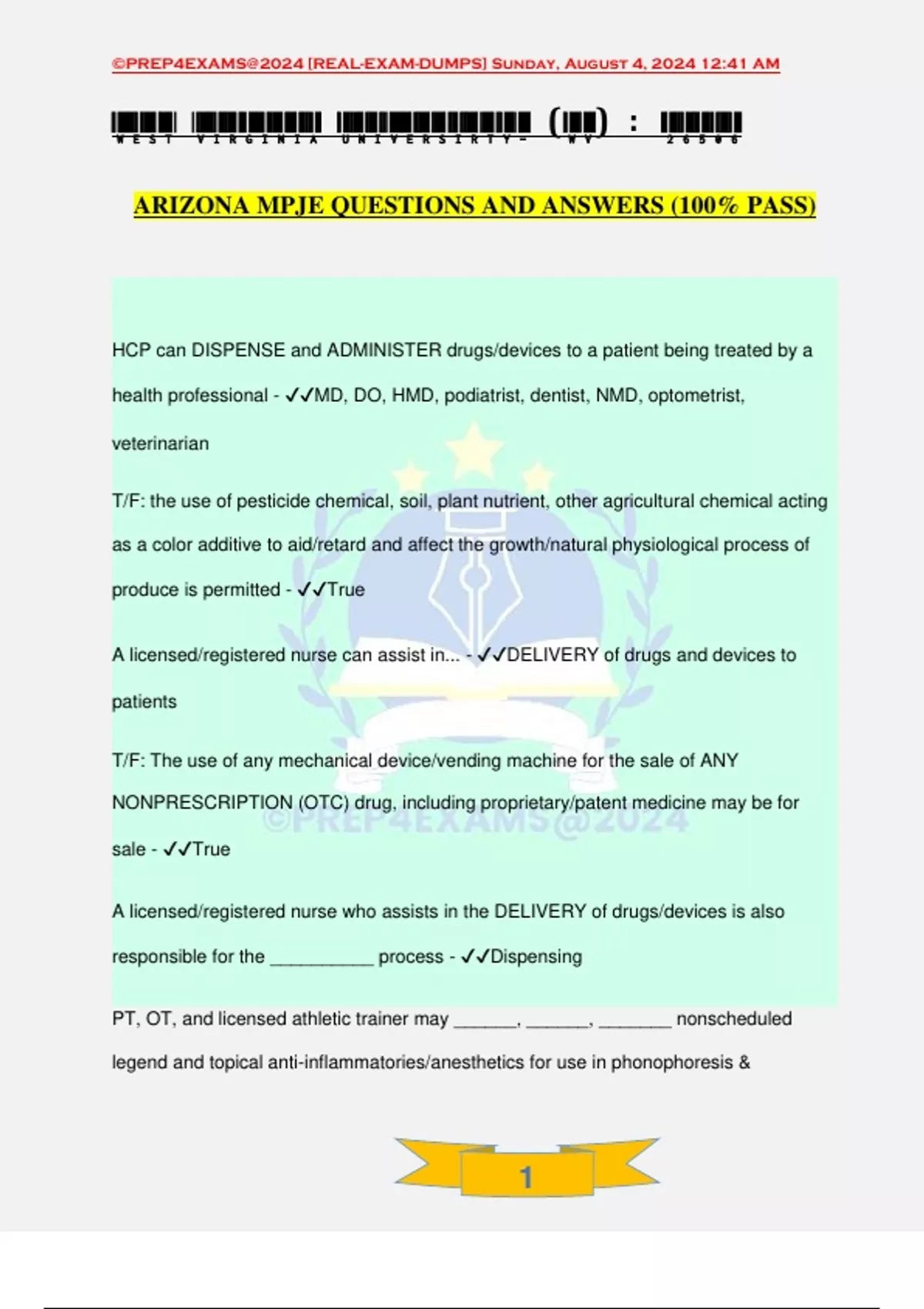 ARIZONA MPJE QUESTIONS AND ANSWERS (100% PASS) HCP can DISPENSE and ADMINISTER drugs/devices to a patient being treated by a health professional - ️️ MD, DO, HMD, podiatrist, dentist, NMD, optometrist, veterinarian T/F: the use of pesticide chemical, soil, plant nutrient, other agricultural chemical acting as a color additive to aid/retard and affect the growth/natural physiological process of produce is permitted - ️️ True A licensed/registered nurse can assist in... - ️️ DELIVERY of drugs and devices to patients T/F: The use of any mechanical device/vending machine for the sale of ANY NONPRESCRIPTION (OTC) drug, including proprietary/patent medicine may be for sale - ️️ True A licensed/registered nurse who assists in the DELIVERY of drugs/devices is also responsible for the __________ process - ️️ Dispensing PT, OT, and licensed athletic trainer may ______, ______, _______ nonscheduled legend and topical anti-inflammatories/anesthetics for use in phonophoresis & ©PREP4EXAMS@2024 [REAL-EXAM-DUMPS] Sunday, August 4, 2024 12:41 AM WEST VIRGINIA UNIVERSIRTY- (WV) : 26506 2 iontophoresis procedures and activities within the scope of practice - ️️ Procure, store, and administer A public health facility & a community health center may... - ️️ Dispense medication/devices to patients at NO COST without providing a written prescription if the facility/center meets storage, labeling, safety, and record keeping rules set by the Board A person who is licensed & practicing at a public health facility or qualifying community health center involved in DISPENSING medication/devices (whether for a charge or no cost), shall..... - ️️ REGISTER to dispense with the Board, BUT is EXEMPT from paying registration fees What is considered a qualifying community health center? - ️️ A primary care clinic recognized as nonprofit under section 501(C)(3) of the US and whose board of directors include patients of the center and residents of the center's service area RPH, intern, tech, trainees are NOT REQUIRED to disclose (1) (2) (3) when filing an application - ️️ (1) a single misdemeanor CHARGE that was dismissed, expunged, or set aside for > 5 years from date of application ©PREP4EXAMS@2024 [REAL-EXAM-DUMPS] Sunday, August 4, 2024 12:41 AM WEST VIRGINIA UNIVERSIRTY- (WV) : 26506 3 (2) a single misdemeanor CONVICTION that occurred > 10 years from date of application (3) a felony CONVICTION that was reduced to a misdemeanor or dismissed, expunged, or set aside for > 10 years from date of application An applicant/licensee who has had 2 or more charges/convictions (ex. misdemeanor, felony) must.... - ️️ Disclose that information to the board Applicant requirements for pharmacist licensure - ️️ - be of good moral character - graduate from an accredited pharmacy school (or school recognized by the Board) - completed IPPE/APPEs under direct RPH supervision - pass the NAPLEX and MPJE - pay an application fee by the Board of no more than $500 The Board may license a pharmacist WITHOUT requiring the NAPLEX if they are - ️️ Licensed as a RPH by a pharmacist licensure ex