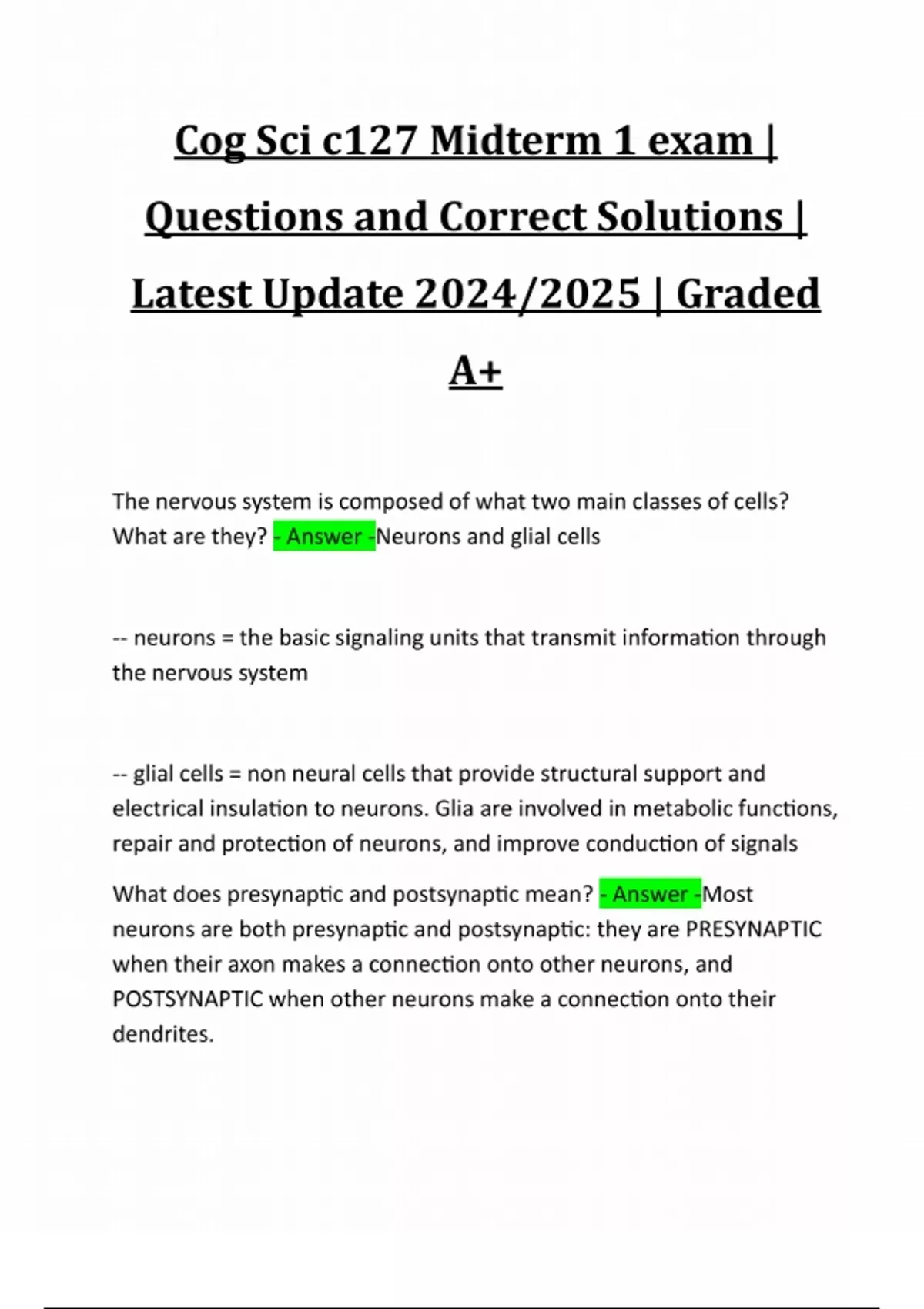 Cog Sci c127 Midterm 1 exam | Questions and Correct Solutions | Latest Update 2024/2025 | Graded A+ The nervous system is composed of what two main classes of cells? What are they? - Answer -Neurons and glial cells -- neurons = the basic signaling units that transmit information through the nervous system -- glial cells = non neural cells that provide structural support and electrical insulation to neurons. Glia are involved in metabolic functions, repair and protection of neurons, and improve conduction of signals What does presynaptic and postsynaptic mean? - Answer -Most neurons are both presynaptic and postsynaptic: they are PRESYNAPTIC when their axon makes a connection onto other neurons, and POSTSYNAPTIC when other neurons make a connection onto their dendrites.What does permeability mean? - Answer -The extent to which a particular ion can cross the membrane through a given ion channel is referred to as its permeability Neuron Anatomy - Answer -Important parts: Soma = cell body Axon = transmitting process Dendrite = receiving process Synapse = gap between neurons Nodes of Ravier = not covered by myelin to aid in saltatory conduc