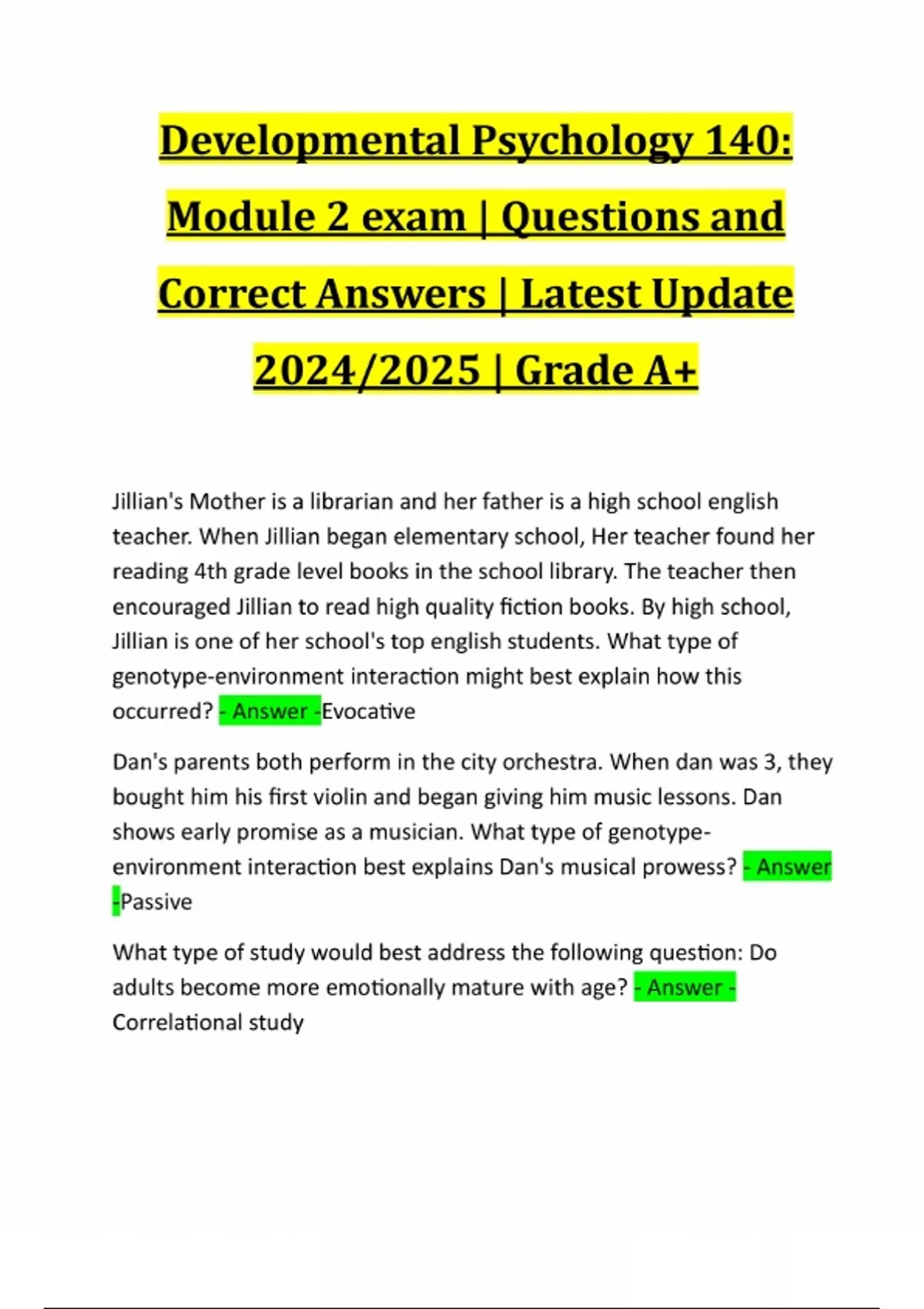 Developmental Psychology 140: Module 2 exam | Questions and Correct Answers | Latest Update 2024/2025 | Grade A+ Jillian's Mother is a librarian and her father is a high school english teacher. When Jillian began elementary school, Her teacher found her reading 4th grade level books in the school library. The teacher then encouraged Jillian to read high quality fiction books. By high school, Jillian is one of her school's top english students. What type of genotype-environment interaction might best explain how this occurred? - Answer -Evocative Dan's parents both perform in the city orchestra. When dan was 3, they bought him his first violin and began giving him music lessons. Dan shows early promise as a musician. What type of genotypeenvironment interaction best explains Dan's musical prowess? - Answer -Passive What type of study would best address the following question: Do adults become more emotionally mature with age? - Answer - Correlational studyDuring involution, a mother's uterus returns to its normal size, reducing from an average of _________ pounds at the end of the pregnancy to ________ ounces. - Answer -