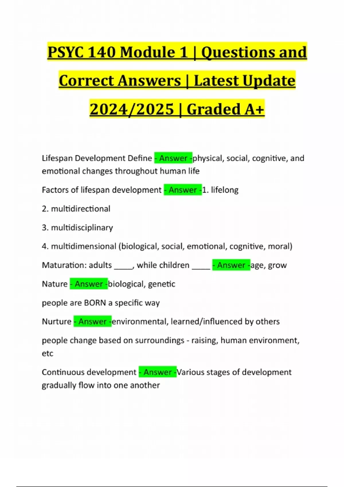 PSYC 140 Module 1 | Questions and Correct Answers | Latest Update 2024/2025 | Graded A+ Lifespan Development Define - Answer -physical, social, cognitive, and emotional changes throughout human life Factors of lifespan development - Answer -1. lifelong 2. multidirectional 3. multidisciplinary 4. multidimensional (biological, social, emotional, cognitive, moral) Maturation: adults ____, while children ____ - Answer -age, grow Nature - Answer -biological, genetic people are BORN a specific way Nurture - Answer -environmental, learned/influenced by others people change based on surroundings - raising, human environment, etc Continuous development - Answer -Various stages of development gradually flow into one anotherCan be difficult to determine when one stage starts and another starts Behaviorists Discontinuous development - Answer -Developmental stages are distinct One stage definitely ends before another begins Stage theori