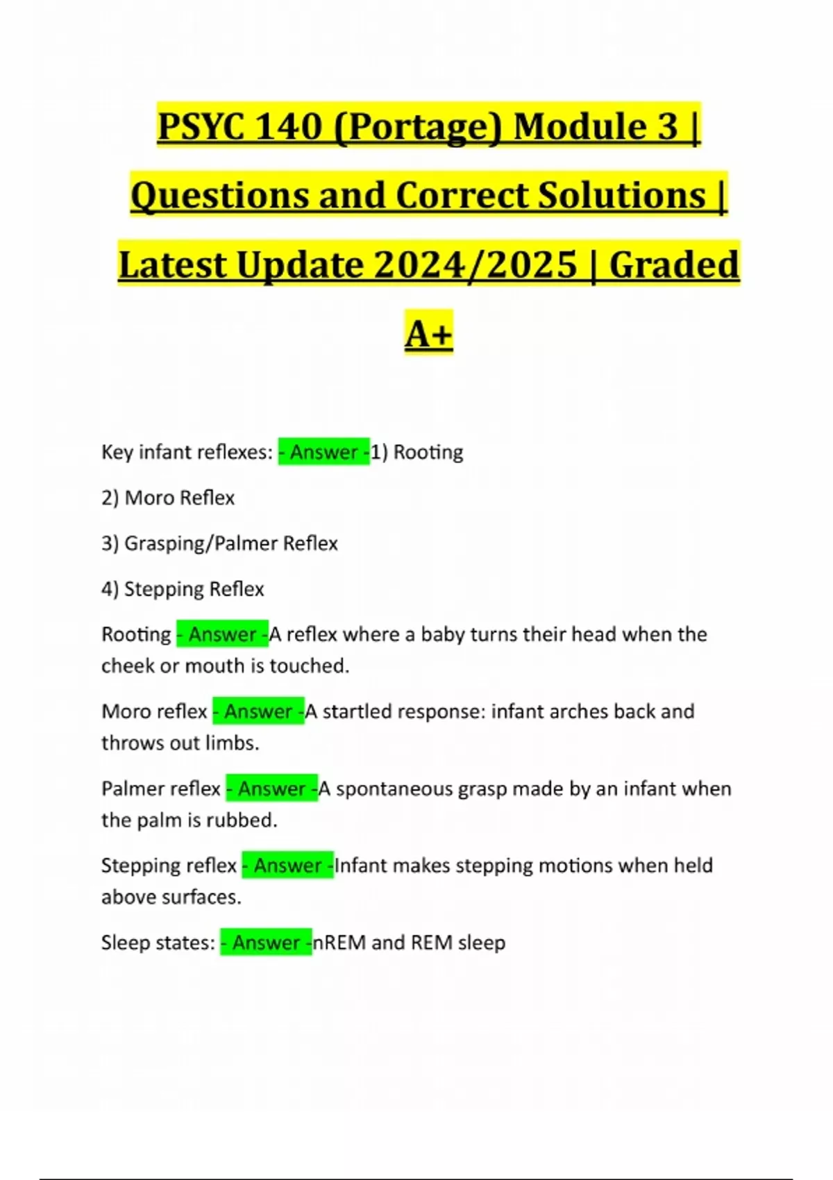 PSYC 140 (Portage) Module 3 | Questions and Correct Solutions | Latest Update 2024/2025 | Graded A+ Key infant reflexes: - Answer -1) Rooting 2) Moro Reflex 3) Grasping/Palmer Reflex 4) Stepping Reflex Rooting - Answer -A reflex where a baby turns their head when the cheek or mouth is touched. Moro reflex - Answer -A startled response: infant arches back and throws out limbs. Palmer reflex - Answer -A spontaneous grasp made by an infant when the palm is rubbed. Stepping reflex - Answer -Infant makes stepping motions when held above surfaces. Sleep states: - Answer -nREM and REM sleepnREM sleep - Answer -Regular sleep, non-rapid eye movement, where the baby is nearly