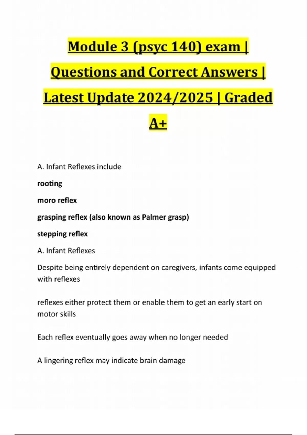 Module 3 (psyc 140) exam | Questions and Correct Answers | Latest Update 2024/2025 | Graded A+ A. Infant Reflexes include rooting moro reflex grasping reflex (also known as Palmer grasp) stepping reflex A. Infant Reflexes Despite being entirely dependent on caregivers, infants come equipped with reflexes reflexes either protect them or enable them to get an early start on motor skills Each reflex eventually goes away when no longer needed A lingering reflex may indicate brain damagerooting involves the baby turning her head when her cheek or mouth is touched It presumably aids feeding as the infant finds something to suck moro reflex startle response infant arches back and throws out arms and legs infant behaves much as we would if we felt we were falling and tried