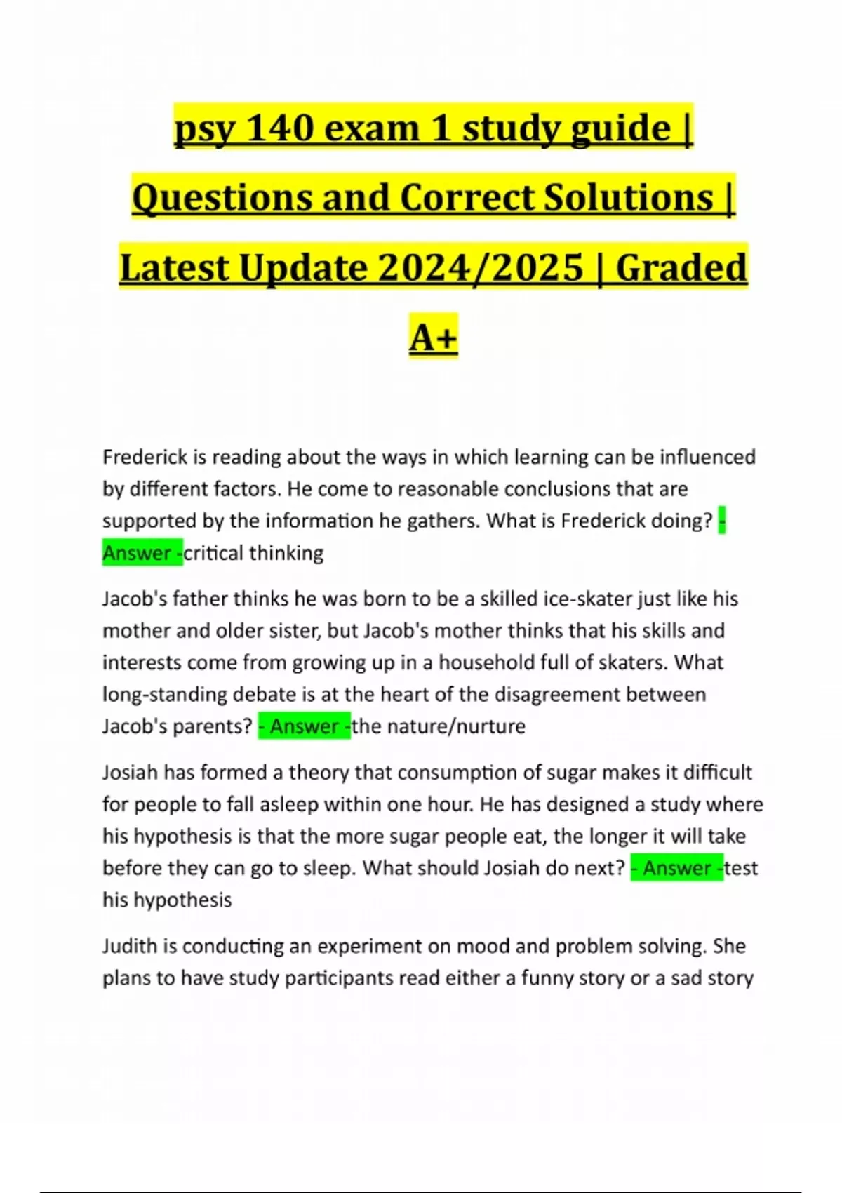 psy 140 exam 1 study guide | Questions and Correct Solutions | Latest Update 2024/2025 | Graded A+ Frederick is reading about the ways in which learning can be influenced by different factors. He come to reasonable conclusions that are supported by the information he gathers. What is Frederick doing? - Answer -critical thinking Jacob's father thinks he was born to be a skilled ice-skater just like his mother and older sister, but Jacob's mother thinks that his skills and interests come from growing up in a household full of skaters. What long-standing debate is at the heart of the disagreement between Jacob's parents? - Answer -the nature/nurture Josiah has formed a theory that consumption of sugar makes it difficult for people to fall asleep within one hour. He has designed a study where his hypothesis is that the more sugar people eat, the longer it will take before they can go to sleep. What should Josiah do next? - Answer -test his hypothesis Judith is conducting an experiment on mood and problem solving. She plans to have study participants read either a funny story or a sad storybefore taking a math test. What is the dependent variable in Judith's study? - Answer -the number of math problems participants correctly solved Kerrie is an undergraduate who is thinking about majoring in psychology. She also works part-time, and she is very interested in how her company builds morale and helps motivate her coworkers. What subfield of psychology might Kerrie want to examine more closely? - Answer -organizational psychology Louisa is writing an essay that discusses