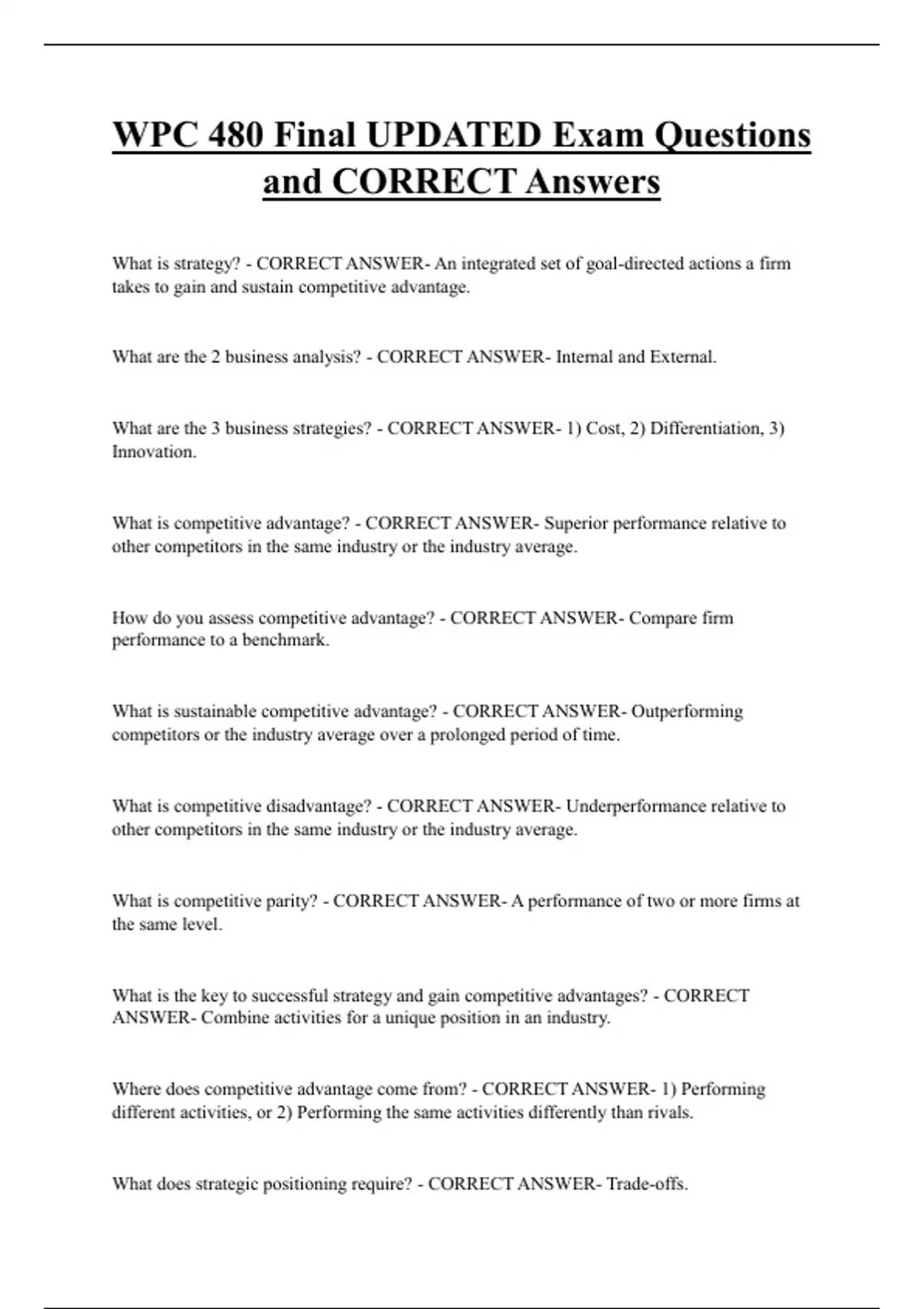 WPC 480 Final UPDATED Exam Questions and CORRECT Answers What is strategy? - CORRECT ANSWER- An integrated set of goal-directed actions a firm takes to gain and sustain competitive advantage. What are the 2 business analysis? - CORRECT ANSWER- Internal and External. What are the 3 business strategies? - CORRECT ANSWER- 1) Cost, 2) Differentiation, 3) Innovation. What is competitive advantage? - CORRECT ANSWER- Superior performance relative to other competitors in the same industry or the industry average. How do you assess competitive advantage? - CORRECT ANSWER- Compare firm performance to a benchmark.