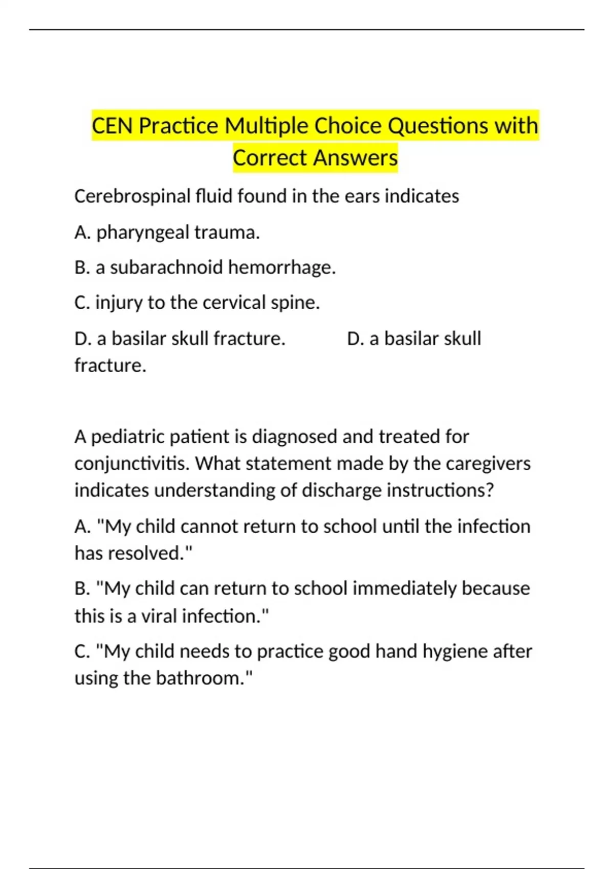 CEN Multiple Choice Questions with Correct Answers