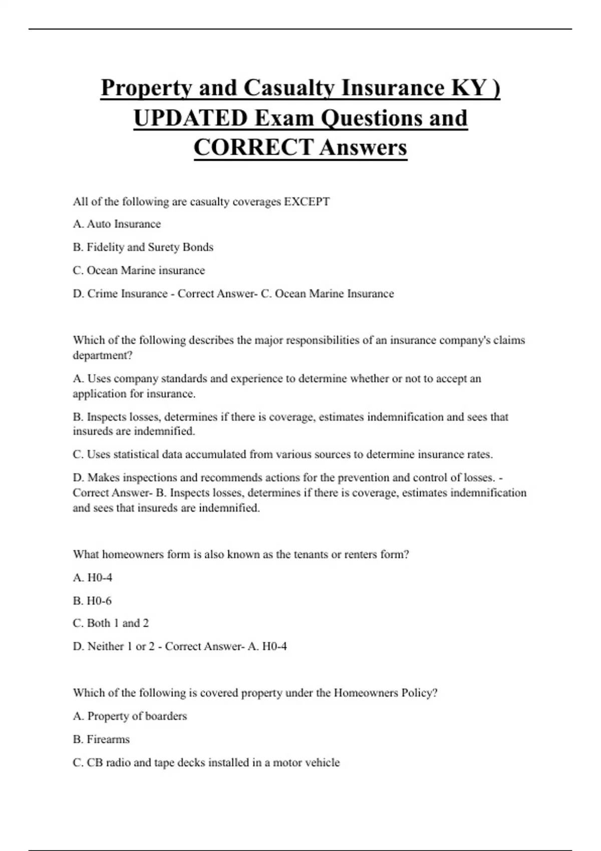 D. Commercial Property coverage - Correct Answer- B. Ocean Marine coverage