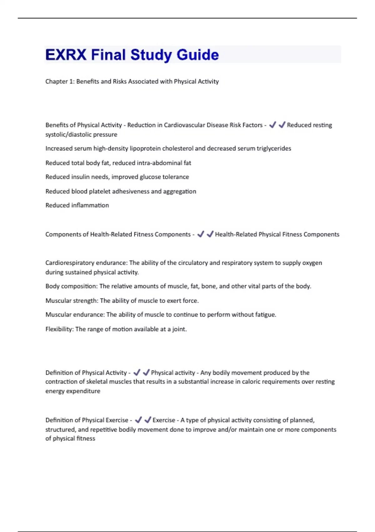 Chapter 1: Benefits and Risks Associated with Physical Activity Benefits of Physical Activity - Reduction in Cardiovascular Disease Risk Factors - Reduced resting systolic/diastolic pressure Increased serum high-density lipoprotein cholesterol and decreased serum triglycerides Reduced total body fat, reduced intra-abdominal fat Reduced insulin needs, improved glucose tolerance Reduced blood platelet adhesiveness and aggregation Reduced inflammation Components of Health-Related Fitness Components - Health-Related Physical Fitness Components Cardiorespiratory endurance: The ability of the circulatory and respiratory system to supply oxygen during sustained physical activity. Body composition: The relative amounts of muscle, fat, bone, and other vital parts of the body. Muscular strength: The ability of muscle to exert force. Muscular endurance: The ability of muscle to continue to perform without fatigue. Flexibility: The range of motion available at a joint. Definition of Physical Activity - Physical activity - Any bodily movement produced by the contraction of skeletal muscles that results in a substantial increase in caloric requirements over resting energy expenditure Definition of Physical Exercise - Exercise - A type of physical activity consisting of planned, structured, and repetitive bodily movement done to improve and/or maintain one or more components of physical fitnessComponents of Skill-Related Fitness Components - Skill-Related Physical Fitness Components Agility: The ability to change the position of the body in space with speed and accuracy. Coordination: The ability to use the senses, such as sight and hearing, together with body parts in performing tasks smoothly and accurately. Balance: The maintenance of equilibrium while stationary or moving. Power: The ability or rate at which one can perform work. Reaction time: The time elapsed between stimulation and the beginning of the reaction to it. Speed: The ability to perform a movement within a short period of time. Definition of METs Ranges for low, moderate, and high intensity - 1 MET = energy cost of rest (1MET = 3,500ml/kg/min) Light: <3 METs Moderate: 3-6 METs; Walking 3mph/Water Aerobics/Biking <10mph, Ballroom Dance/Gardening Vigorous: >6 METs Jogging or running, Lap swimming, Bicycling (>10 mph), Aerobic dancing, Heavy gardening (digging), Backpacking Physical Activity relationship with different disease states (HINT: Inverse Relationship) - 150 min/week of PA = ↓ CHD risk by 14% 300 min/week of PA = ↓ CHD risk by 20% Benefits of Physical Activity - Improvement in Cardiovascular and Respiratory Function - Increased maximal oxygen uptake resulting from both central and peripheral adaptations Decreased minute ventilation at a given absolute submaximal intensity Decreased myocardial oxygen cost for a given absolute submaximal intensityDecreased heart rate and blood pressure at a given submaximal intensity Increased capillary density in skeletal muscle Increased exercise threshold for the accumulation of lactate in the blood Increased exercise threshold for the onset of disease signs or symptoms (e.g., angina pectoris, ischemic ST-segment depression, claudication) Benefits of Physical Activity - Decreased Morbidity and Mortality - Primary prevention (i.e., interventions to prevent the initial occurrence) Higher activity and/or fitness levels are associated with lower death rates from coronary artery disease Higher activity and/or fitness levels are associated with lower incidence rates for CVD, CAD, stroke, Type 2 diabetes mellitus, metabolic syndrome, osteoporotic fractures, cancer of the colon and breast, and gallbladder disease Secondary prevention (i.e., interventions after a cardiac event to prevent another) Based on meta-analyses (i.e., pooled data across studies), cardiovascular and all-cause mortality are reduced in patients with post-myocardial infarction (MI) who participate in cardiac rehabilitation exercise training, especially as a component of multifactorial risk factor reduction Randomized controlled trials of cardiac rehabilitation exercise training involving patients with post-MI do not support a reduction in the rate of nonfatal reinfarction (MI).