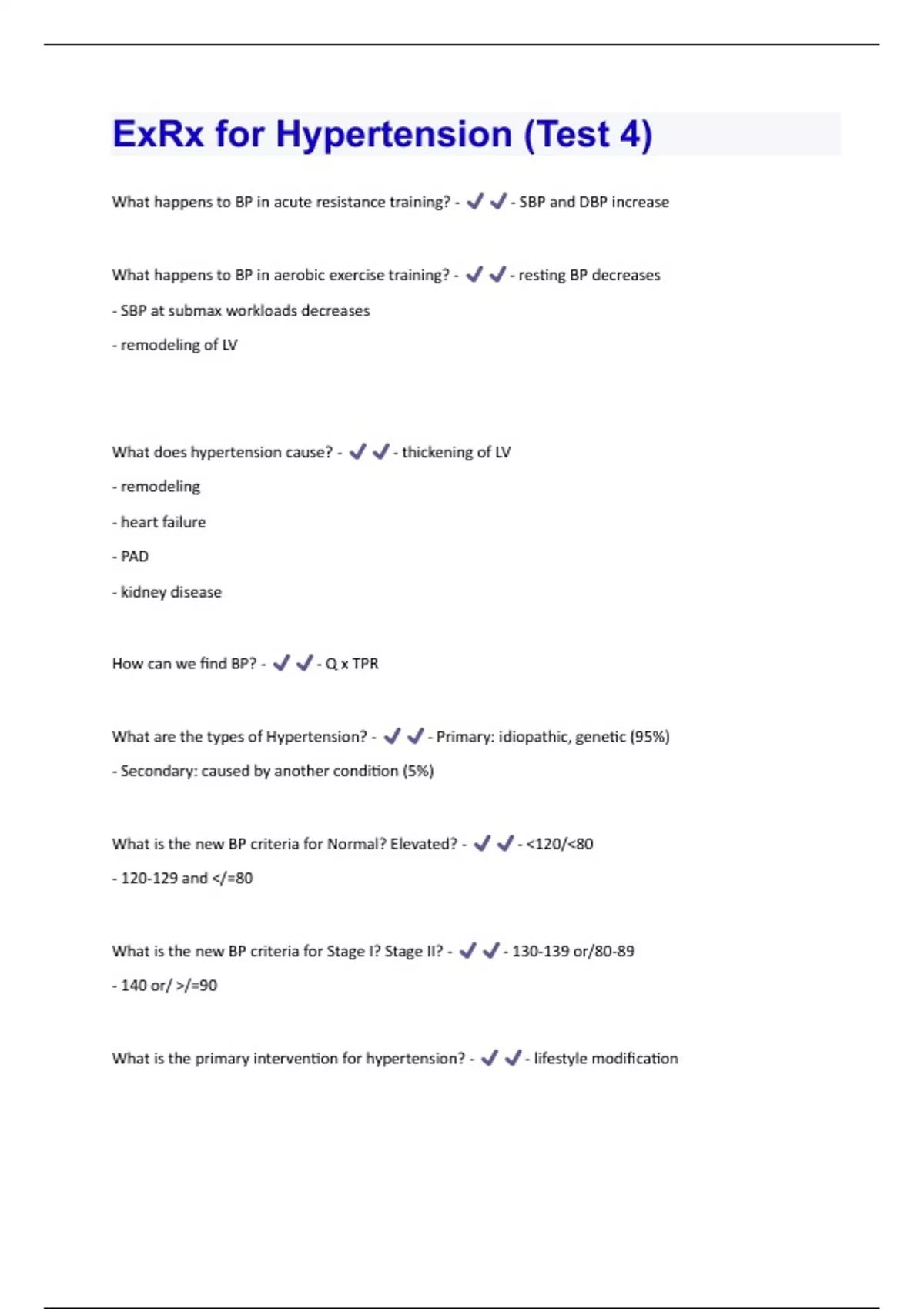 What happens to BP in acute resistance training? - - SBP and DBP increase What happens to BP in aerobic exercise training? - - resting BP decreases - SBP at submax workloads decreases - remodeling of LV What does hypertension cause? - - thickening of LV - remodeling - heart failure - PAD - kidney disease How can we find BP? - - Q x TPR What are the types of Hypertension? - - Primary: idiopathic, genetic (95%) - Secondary: caused by another condition (5%) What is the new BP criteria for Normal? Elevated? - - <120/<80 - 120-129 and </=80 What is the new BP criteria for Stage I? Stage II? - - 130-139 or/80-89 - 140 or/ >/=90 What is the primary intervention for hypertension? - - lifestyle modificationWhat is the difference between the new and older hypertension criteria? - - pre hyper tension stage was eliminated - small increase in prescribed meds - doubled risk of CVD complication - tripled # of men <45, doubled # women <45 diagnosed When do we prescribe meds in stage I? - - if theyve had MI or stroke - high risk of MI or stroke - diabetes - Chronic Kidney Disease (CKD) - atherosclerosis risk What are the risk factors for hypertension? - - age - obese - family hx - inactivity - smokers/drinkers - stress - diet What does hypertension increase the risk for? - - CVD - stroke - heart failure - PAD - chronic kidney disease When does the risk for CVD double? - - increases of 10mmHg in either BP What is the hypertension risk factor criteria? - - SBP >/= 130 OR DBP >/= 80- hypertension meds - 2-3 measures of high BP by professional When is general medical clearance for hypertension needed? - - severe uncontrolled HTN >180/>110 - need meds What happens to BP in acute aerobic training? - - SBP increases (10 mmHg) - DBP stays the same or decreases What happens to BP in resistance exercise training? - - decreases When does post exercise hypotension occur? what does it do? - - 24 hours - centrally: decreases sympathetic nerve activity - peripherally: lowers TPR, plasma volume What is the FITT for CV exercise? what else do we need to do? - - F: 5-7 days/week - I: 40-59% of VO2 or HRR, RPE 11-13 - T: bike, treadmill, rower, elliptical - T: 30-60 min/day (continuous or intermittent) - maintain SBP >/=220 and DPB >/= 105 during cardio What is the FITT for RT for hypertension? - - F: 2-3 days/week - I: 60-70% 1RM -->80%, 11-13 RPE (avoid failure) - T: free weights, bands, machines - T: 2-4 submax sets, 8-12 reps What does RT BP response depend on? - - amount of muscle mass recruited- amount of resistance lifted - # of reps - Speed of lifting - rest b/w sets - breathing techniques What are the antihypertensive meds? what do they do? - - B blockers: attenuate HR and BP response to exercise, reduce work capacity, hinder thermoregulation - Na channel blocker, alpha, antagonist, vasodilators