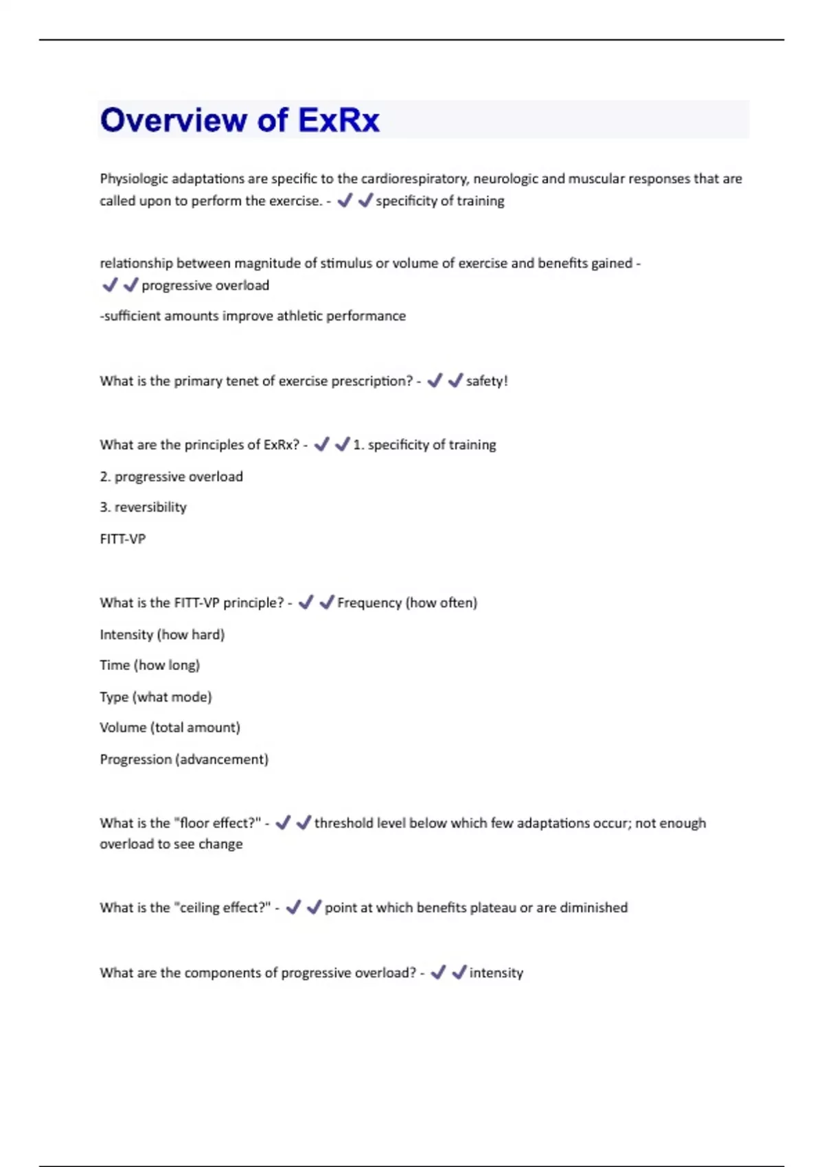 Physiologic adaptations are specific to the cardiorespiratory, neurologic and muscular responses that are called upon to perform the exercise. - specificity of training relationship between magnitude of stimulus or volume of exercise and benefits gained - progressive overload -sufficient amounts improve athletic performance What is the primary tenet of exercise prescription? - safety! What are the principles of ExRx? - 1. specificity of training 2. progressive overload 3. reversibility FITT-VP What is the FITT-VP principle? - Frequency (how often) Intensity (how hard) Time (how long) Type (what mode) Volume (total amount) Progression (advancement) What is the "floor effect?" - threshold level below which few adaptations occur; not enough overload to see change What is the "ceiling effect?" - point at which benefits plateau or are diminished What are the components of progressive overload? - intensityfrequency duration loss of training adaptation due to inactivity - reversibility -if a minimal training stimulus is not maintained, any training effect erodes or reverses The optimal ExRx should address the health-related components of? - 1. aerobic 2. muscular strength and endurance 3. flexibility 4. body composition 5. neuromotor fitness (balance, dynamic, agility, coordination) There should be two "plans" for the ExRx, which are? - 1. decrease inactivity 2. increase physical activity What should be included in the ExRx to reduce musculoskeletal injury and complications? What are ACSM recommendations? - warm up (5-10 min) (conditioning 20-60 minutes) cool down (5-10 min) stretching (10 min after warm up or cool down) gradual progression of volume and intensity How can serious risk of CVD complications be minimized? - 1. use pre-participation health screen and eval 2. begin exercise at light to mod intensity 3. gradual progression of quantity and quality of exercises Stretching shows "chronic improvement" in flexibility after what duration and frequency? - 3-4 weeks of stretching 2-3x/week-daily flexibility exercise most effective True or False: Postural stability and balance can be improved by engaging in flexibility exercises. - True, esp. when combined with resistance exercise Why should flexibility exercises be performed after exercise and sports where strength and power are important for performance? - stretching exercises may result in a short-term decrease in muscle strength and power What are the flexibility recommendations for most adults? - 60 seconds/joint -hold each 10-30 sec to point of tightness or discomfort Neuromotor exercise is sometimes referred to as? - functional fitness training What are the benefits of neuromotor exercise? - improvements in balance, agility, strength reduce risk of falling reduce fear of falling