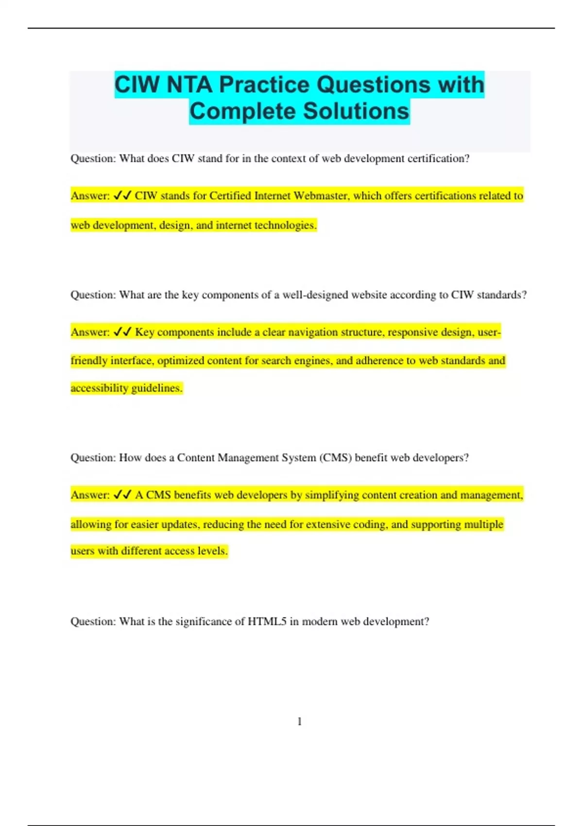 CIW NTA Practice Questions with Complete Solutions Question: What does CIW stand for in the context of web development certification? Answer: CIW stands for Certified Internet Webmaster, which offers certifications related to web development, design, and internet technologies. Question: What are the key components of a well-designed website according to CIW standards? Answer: Key components include a clear navigation structure, responsive design, user- friendly interface, optimized content for search engines, and adherence to web standards and accessibility guidelines. Question: How does a Content Management System (CMS) benefit web developers? Answer: A CMS benefits web developers by simplifying content creation and management, allowing for easier updates, reducing the need for extensive coding, and supporting multiple users with different access levels. Question: What is the significance of HTML5 in modern web development? 2 Answer: HTML5 is significant because it provides enhanced support for multimedia, improved semantics, and greater control over web page structure, which leads to better performance, accessibility, and compatibility across different devices. Question: What are the advantages of using CSS for styling web pages? Answer: CSS allows for separation of content from design, making it easier to maintain and update styles, ensures consistent look across multiple pages, and enhances load times by reducing redundancy in HTML code. Question: How does JavaScript enhance interactivity on web pages? Answer: JavaScript enhances interactivity by enabling dynamic content updates, handling user inputs, and creating interactive elements such as forms, animations, and responsive design features without requiring page reloads. Question: What role does SEO play in web development, and how can it be implemented effectively? Answer: SEO (Search Engine Optimization) improves a website's visibility in search engine results. Effective implementation includes using relevant keywords, optimizing meta tags, creating high-quality content, and ensuring proper site structure and mobile-friendliness. 3 Question: What are some best practices for ensuring website accessibility? Answer: Best practices for website accessibility include providing alt text for images, ensuring sufficient color contrast, using
