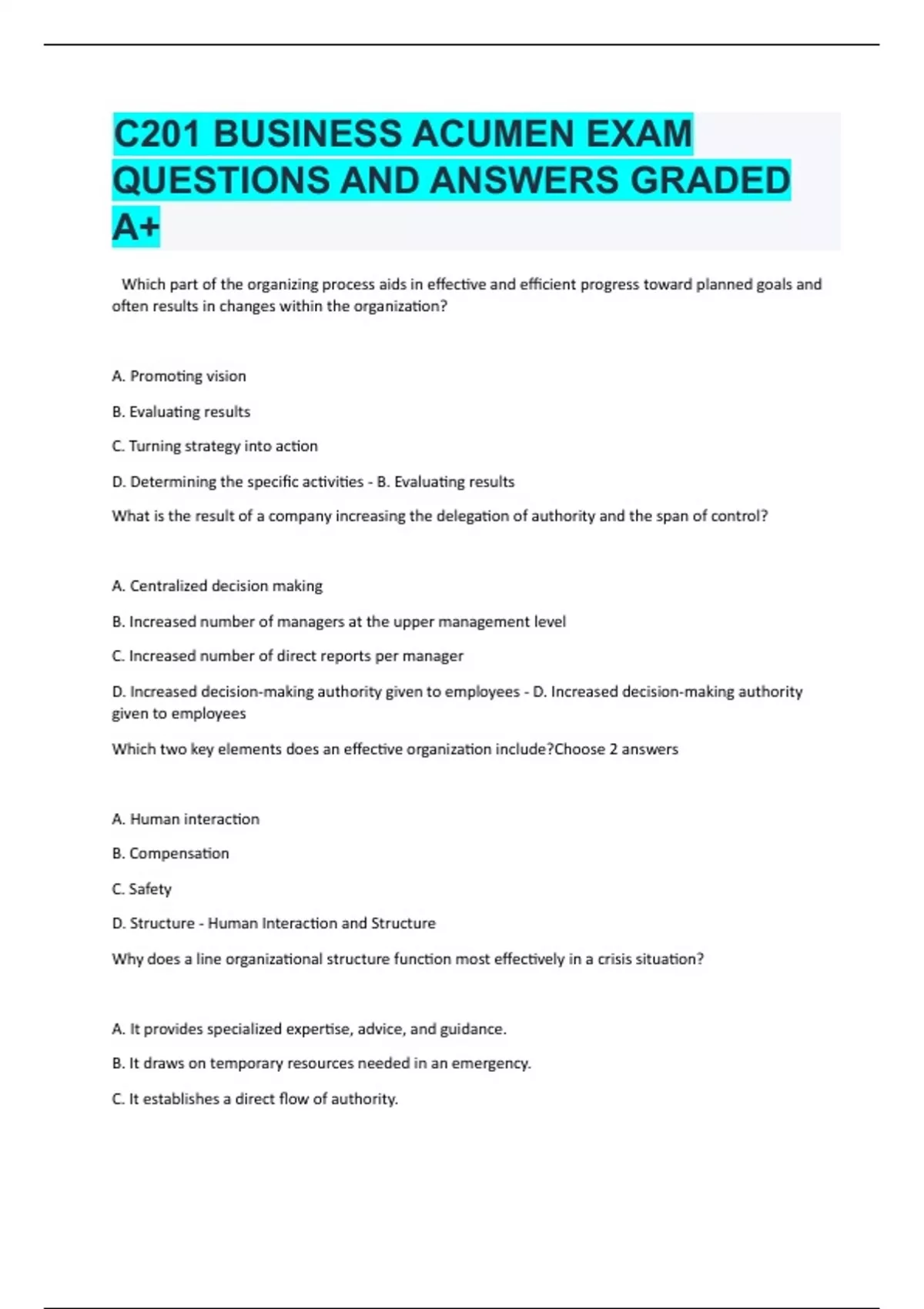 D. Increased decision-making authority given to employees - D. Increased decision-making authority