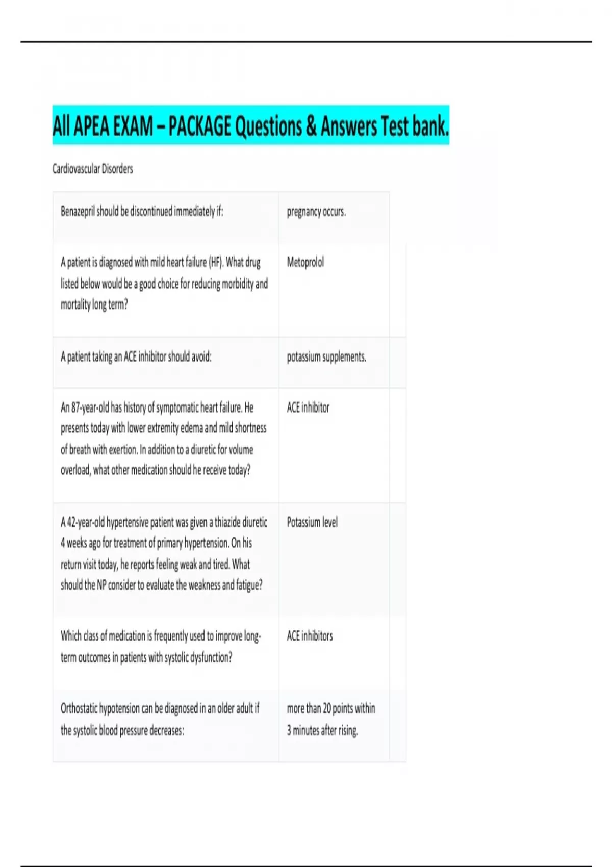 All APEA EXAM – PACKAGE Questions & Answers Test bank Stuvia Is Available For Download After Purchase. In Case You Encounter Any Difficulties With The Download, Please Feel Free To Reach Out To Me. I Will Promptly Send It To You Through Google Doc or Email. Thank You APEA EXAMs Test bank-with 100%. verified answers-2022. Cardiovascular Disorders Benazepril should be discontinued immediately if: pregnancy occurs. A patient is diagnosed with mild heart failure (HF). What drug listed below would be a good choice for reducing morbidity and mortality long term? Metoprolol A patient taking an ACE inhibitor should avoid: potassium supplements. An 87-year-old has history of symptomatic heart failure. He presents today with lower extremity edema and mild shortness of breath with exertion. In addition to a diuretic for volume overload, what other medication should he receive today? ACE inhibitor A 42-year-old hypertensive patient was given a thiazide diuretic 4 weeks ago for treatment of primary hypertension. On his return visit today, he reports feeling weak and tired. What should the NP consider to evaluate the weakness and fatigue? Potassium level Which class of medication is frequently used to improve long- term outcomes in patients with systolic dysfunction? ACE inhibitors Orthostatic hypotension can be diagnosed in an older adult if the systolic blood pressure decreases: more than 20 points within 3 minutes after rising. A 74-year-old patient has peripheral artery disease (PAD). Which item listed below is an important nonmodifiable risk factor for PAD? Diabetes The lipid particle with the greatest atherogenic effect is: LDL. Which medication could potentially exacerbate heart failure (HF)? Naproxen Where would the murmur associated with mitral regurgitation best be auscultated? Mitral listening point A 43-year-old Hispanic male has an audible diastolic murmur best heard in the mitral listening point. There is no audible click. His status has been monitored for the past 2 years. This murmur is probably: mitral stenosis. An independent 82-year-old male patient is very active but retired last year. His total cholesterol and LDLs are moderately elevated. How should the NP approach his lipid elevation? Treatment is based on expected length of life A patient who has diabetes presents with pain in his lower legs when he walks and pain resolution with rest. When specifically asked about the pain in his lower leg, he likely will report pain: in the calf muscle. A 75-year-old patient with longstanding hypertension takes an ACE inhibitor and a thiazide diuretic daily. He has developed development of heart failure (HF). dyspnea on exertion and peripheral edema over the past several days. This probably indicates: An ACE inhibitor is specifically indicated in patients who have: hypertension, diabetes with proteinuria, heart failure. The correlation between blood pressure and age greater than 60 years is that as age increases: diastolic blood pressure decreases. A 77-year-old patient has had an increase in blood pressure since the last exam. The blood pressure readings are provided. If medication is to be started on this patient, what would be a good first choice? Calcium channel blocker Mrs. Brandy is having contrast dye next week for a heart catheterization. What drug does NOT need to be stopped prior to her catheterization? Losartan Older adults have a unique blood pressure pattern. Which blood pressure reading below reflects this pattern? 160/60 mmHg A 91-year-old female with longstanding history of chronic heart failure has renal and liver studies that have slowly worsened over the past year. This probably indicates: target organ damage secondary to heart failure. The usual clinical course of mitral valve prolapse: is benign. Which antibiotic should be used with caution if an older patient has cardiac conduction issues? Ciprofloxacin A patient with aortic stenosis has been asymptomatic for decades. On routine exam, he states that he has had some dizziness associated with activity but no chest pain or shortness of breath. The best course of action for the nurse practitioner is to: refer to cardiology. The nurse practitioner is caring for an independent 74-year-old female who had acute coronary syndrome (ACS) about 6 weeks ago. What medications should be part of her regimen unless there is a contraindication? ACE, ASA, beta blocker, and statin Which hypertensive patient is most likely to have adverse blood pressure effects from excessive sodium consumption? 70-year-old African American male A common side effect of thiazide diuretics is: erectile dysfunction. The carotid arteries are auscultated for bruits because: this is indicative of generalized atherosclerosis. Which choice below would be the best choice for an 80-year-old patient whose blood pressure is 172/72 mm Hg? Amlodipine Which item below represents the best choice of antihypertensive agents for the indicated patient? Lisinopril in a 35-year-old Caucasian male A patient with hypertension has been diagnosed with gout. Which home medication may have contributed to this episode of gout? Furosemide You are managing the warfarin dose for an older adult with a prosthetic heart valve. Which situation listed requires that warfarin be discontinued now? INR of 8, no significant bleeding Which of the following medications may have an unfavorable effect on a hypertensive patient's blood pressure? Naproxen Which study would be most helpful in evaluating the degree of hypertrophy of the atrium or ventricle? Echocardiography A patient has had poorly controlled hypertension for more than 10 years. Indicate the most likely position of his point of maximal impulse (PMI): 5th ICS, left of MCL. Drugs that target the renin-angiotensin-aldosterone system are particularly beneficial in patients who have: diabetic nephropathy. A patient taking atorvastatin for newly diagnosed dyslipidemia complains of fatigue, weakness, and muscle aches in his lower back, arms, and