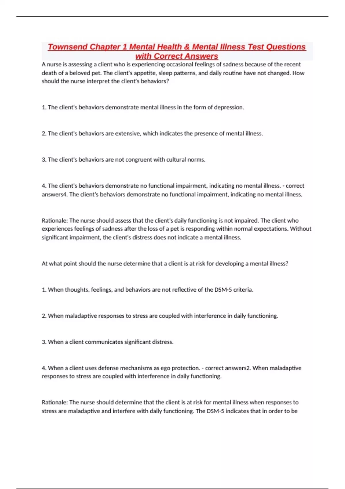 Townsend Chapter 1 Mental Health & Mental Illness Test Questions with Correct Answers A nurse is assessing a client who is experiencing occasional feelings of sadness because of the recent death of a beloved pet. The client's appetite, sleep patterns, and daily routine have not changed. How should the nurse interpret the client's behaviors? 1. The client's behaviors demonstrate mental illness in the form of depression. 2. The client's behaviors are extensive, which indicates the presence of mental illness. 3. The client's behaviors are not congruent with cultural norms. 4. The client's behaviors demonstrate no functional impairment, indicating no mental illness. - correct answers4. The client's behaviors demonstrate no functional impairment, indicating no mental illness. Rationale: The nurse should assess that the client's daily functioning is not impaired. The client who experiences feelings of sadness after the loss of a pet is responding within normal expectations. Without significant impairment, the client's distress does not indicate a mental illness. At what point should the nurse determine that a client is at risk for developing a mental illness? 1. When thoughts, feelings, and behaviors are not reflective of the DSM-5 criteria. 2. When maladaptive responses to stress are coupled with interference in daily functioning. 3. When a client communicates significant distress. 4. When a client uses defense mechanisms as ego protection. - correct answers2. When maladaptive responses to stress are coupled with interference in daily functioning. Rationale: The nurse should determine that the client is at risk for mental illness when responses to stress are maladaptive and interfere with daily functioning. The DSM-5 indicates that in order to be