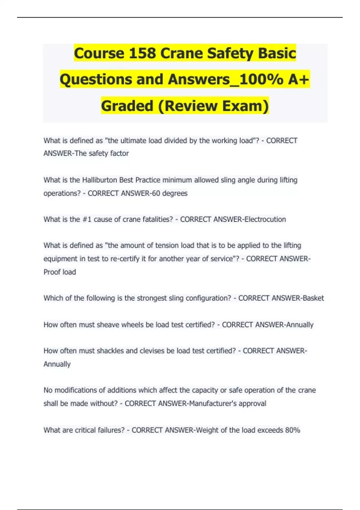 Course 158 Crane Safety Basic Questions and Answers_100% A+ Graded (Review Exam)