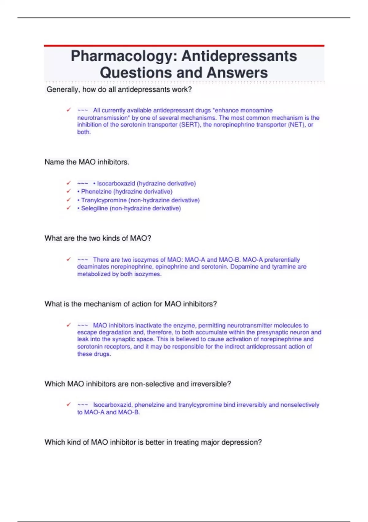 ✓ ~~~ Possible adverse effects of treatment with MAO inhibitors include drowsiness,