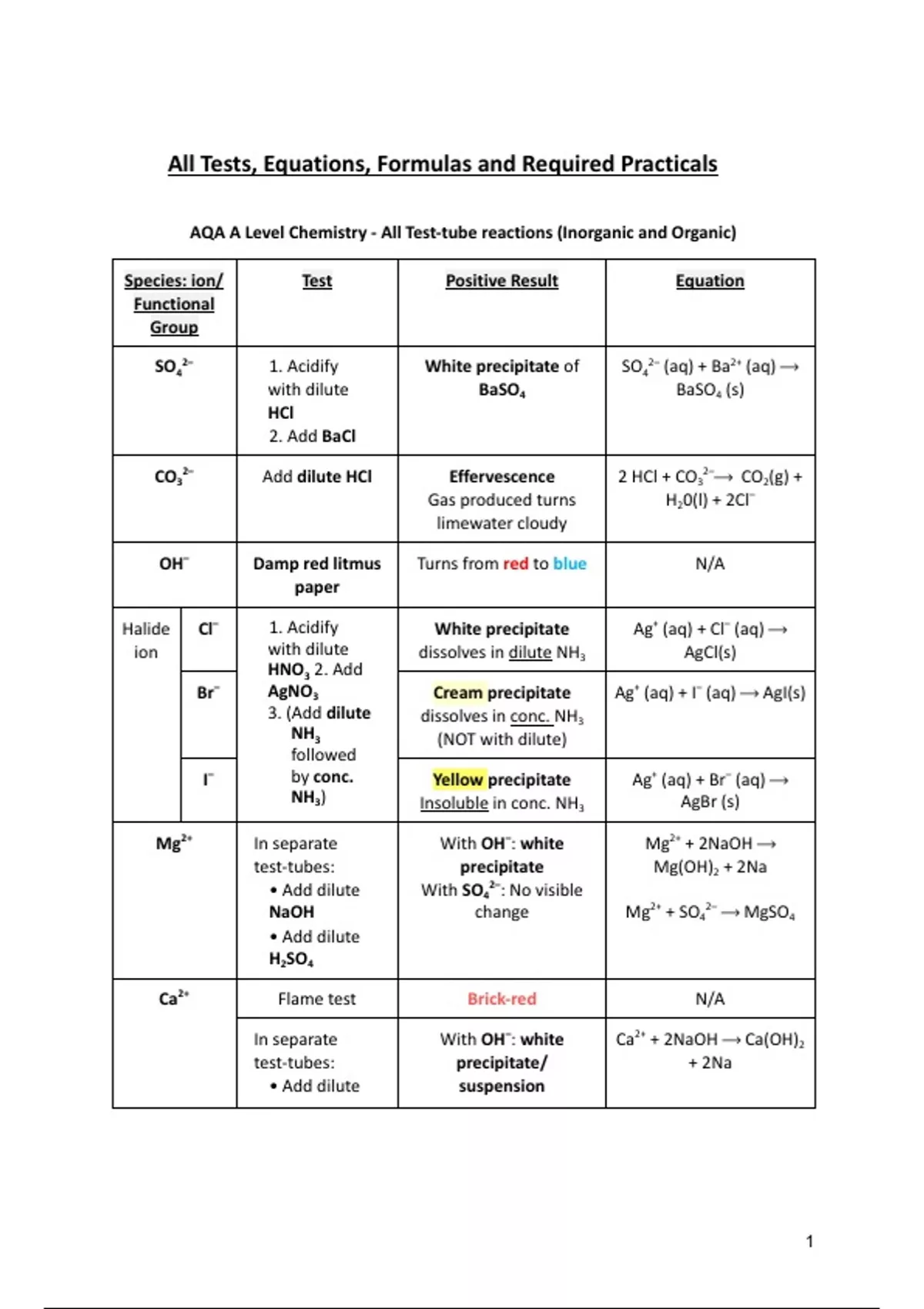 , AQA A Level Chemistry - All Test-tube reactions (Inorganic and Organic)