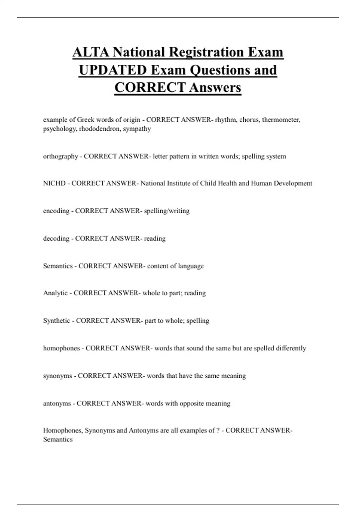 ALTA National Registration Exam UPDATED Exam Questions and CORRECT Answers example of Greek words of origin - CORRECT ANSWER- rhythm, chorus, thermometer, psychology, rhododendron, sympathy orthography - CORRECT ANSWER- letter pattern in written words; spelling system NICHD - CORRECT ANSWER- National Institute of Child Health and Human Development encoding - CORRECT ANSWER- spelling/writing decoding - CORRECT ANSWER- reading Semantics - CORRECT ANSWER- content of language