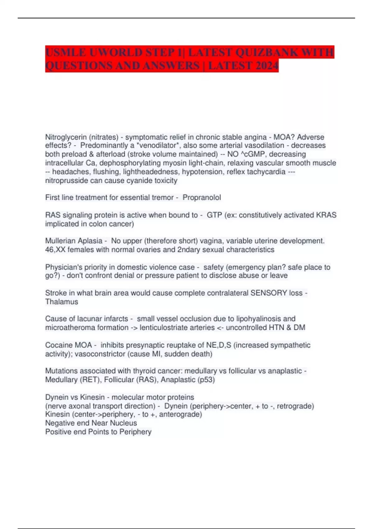 USMLE UWORLD STEP 1| LATEST QUIZBANK WITH QUESTIONS AND ANSWERS | LATEST 2024 Nitroglycerin (nitrates) - symptomatic relief in chronic stable angina - MOA? Adverse effects? - Predominantly a *venodilator*, also some arterial vasodilation - decreases both preload & afterload (stroke volume maintained) -- NO ^cGMP, decreasing intracellular Ca, dephosphorylating myosin light-chain, relaxing vascular smooth muscle -- headaches, flushing, lightheadedness, hypotension, reflex tachycardia --- nitroprusside can cause cyanide toxicity First line treatment for essential tremor - Propranolol RAS signaling protein is active when bound to - GTP (ex: constitutively activated KRAS implicated in colon cancer) Mullerian Aplasia - No upper (therefore short) vagina, variable uterine development. 46,XX females with normal ovaries and 2ndary sexual characteristics Physician's priority in domestic violence case - safety (emergency plan? safe place to go?) - don't confront denial or pressure patient to disclose abuse or leave Stroke in what brain area would cause complete contralateral SENSORY loss - Thalamus Cause of lacunar infarcts - small vessel occlusion due to lipohyalinosis and microatheroma formation -> lenticulostriate arteries <- uncontrolled HTN & DM Cocaine MOA - inhibits presynaptic reuptake of NE,D,S (increased sympathetic activity); vasoconstrictor (cause MI, sudden death) Mutations associated with thyroid cancer: medullary vs follicular vs anaplastic - Medullary (RET), Follicular (RAS), Anaplastic (p53) Dynein vs Kinesin - molecular motor proteins (nerve axonal transport direction) - Dynein (periphery->center, + to -, retrograde) Kinesin (center->periphery, - to +, anterograde) Negative end Near Nucleus Positive end Points to Periphery