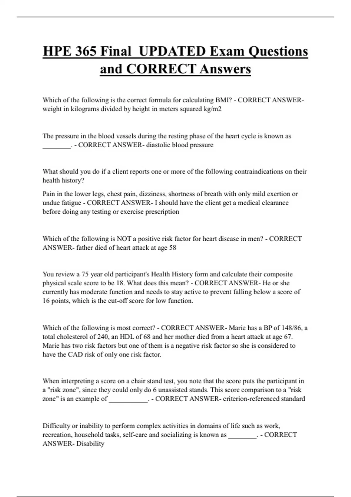 HPE 365 Final UPDATED Exam Questions and CORRECT Answers Which of the following is the correct formula for calculating BMI? - CORRECT ANSWERweight in kilograms divided by height in meters squared kg/m2 The pressure in the blood vessels during the resting phase of the heart cycle is known as ________. - CORRECT ANSWER- diastolic blood pressure What should you do if a client reports one or more of the following contraindications on their health history? Pain in the lower legs, chest pain, dizziness, shortness of breath with only mild exertion or undue fatigue - CORRECT ANSWER- I should have the client get a medical clearance before doing any testing or exercise prescription