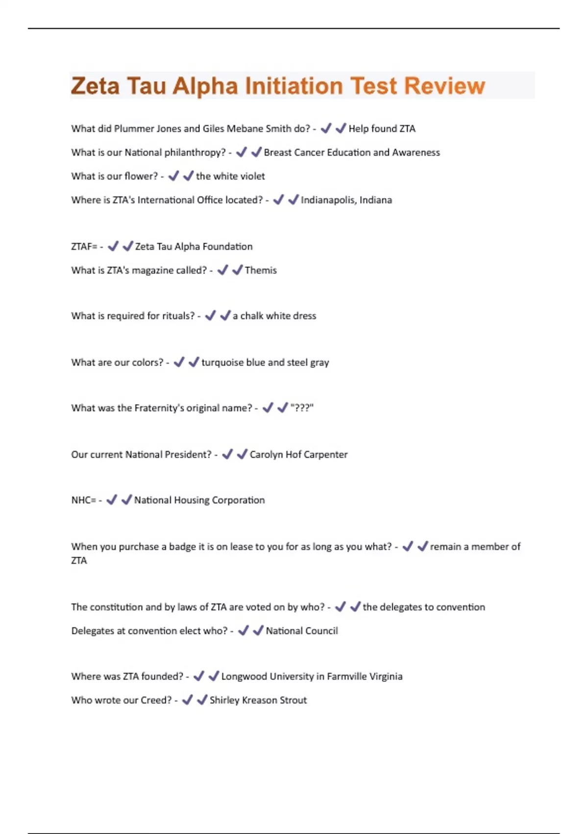 Zeta Tau Alpha Initiation Test Review Questions With Correct Solutions, Already Passed!!