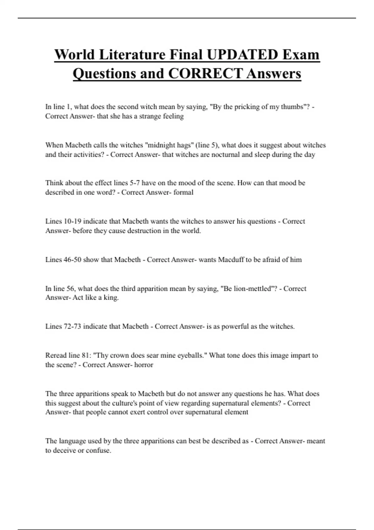 World Literature Final UPDATED Exam Questions and CORRECT Answers In line 1, what does the second witch mean by saying, "By the pricking of my thumbs"? - Correct Answer- that she has a strange feeling When Macbeth calls the witches "midnight hags" (line 5), what does it suggest about witches and their activities? - Correct Answer- that witches are nocturnal and sleep during the day Think about the effect lines 5-7 have on the mood of the scene. How can that mood be described in one word? - Correct Answer- formal