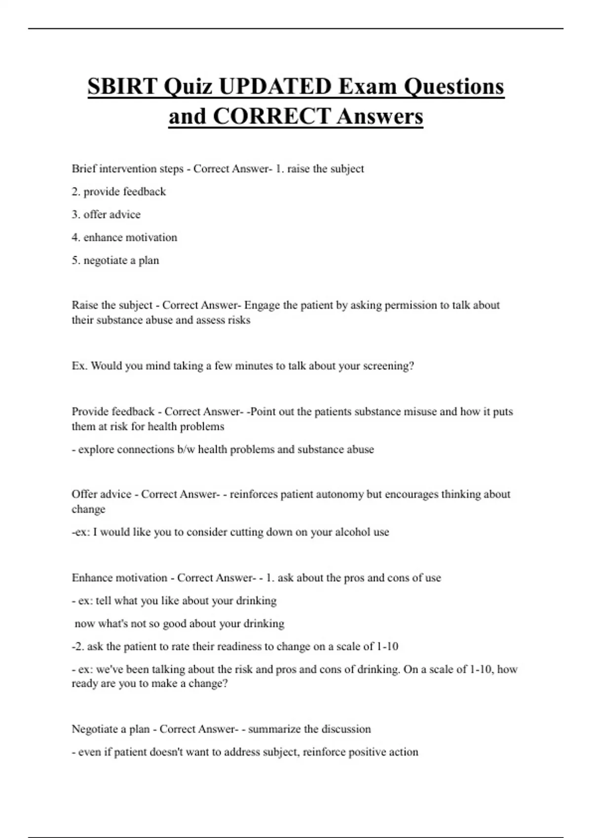 SBIRT Quiz UPDATED Exam Questions and CORRECT Answers Brief intervention steps - Correct Answer- 1. raise the subject 2. provide feedback 3. offer advice 4. enhance motivation 5. negotiate a plan Raise the subject - Correct Answer- Engage the patient by asking permission to talk about their substance abuse and assess risks