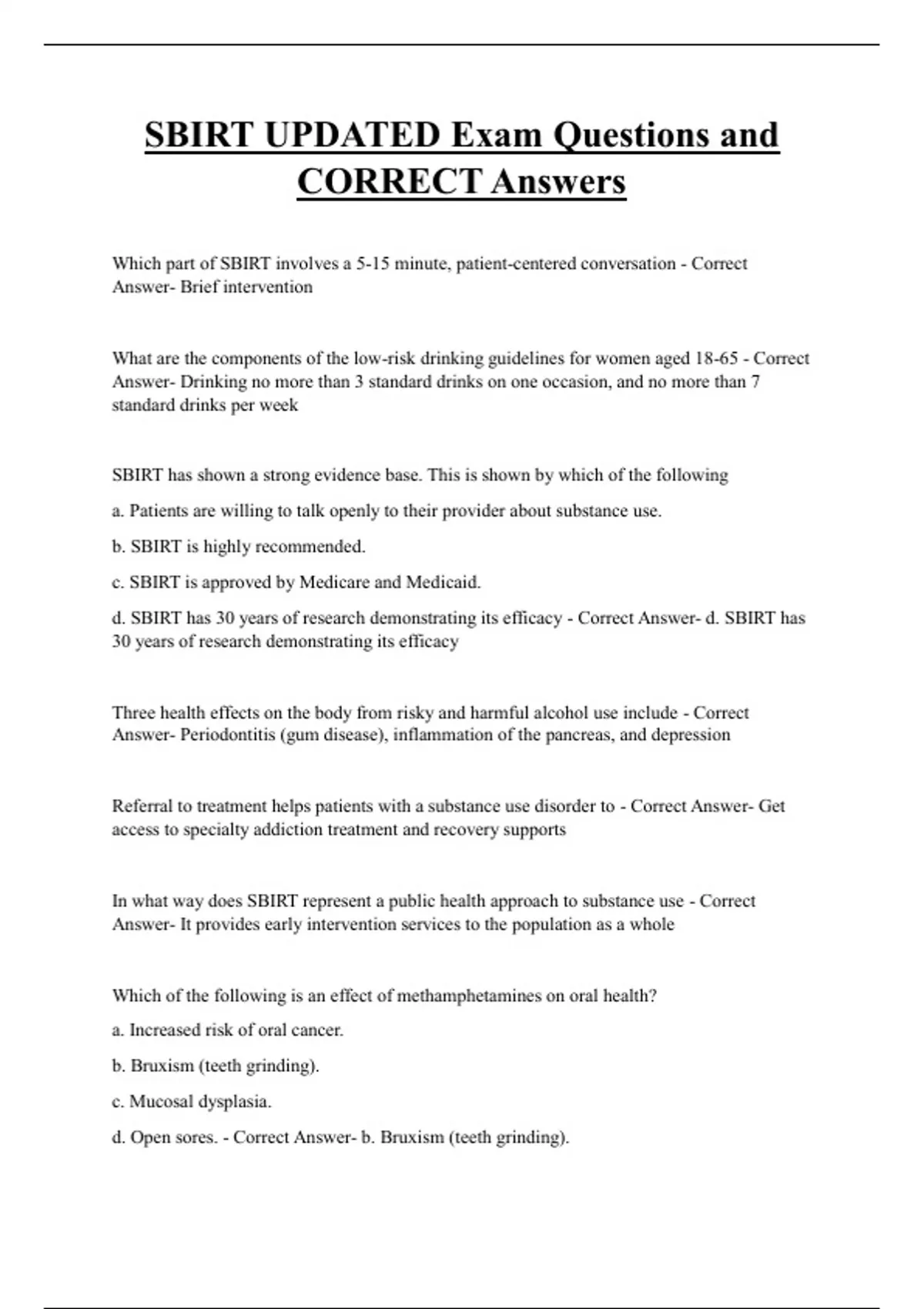 SBIRT UPDATED Exam Questions and CORRECT Answers Which part of SBIRT involves a 5-15 minute, patient-centered conversation - Correct Answer- Brief intervention What are the components of the low-risk drinking guidelines for women aged 18-65 - Correct Answer- Drinking no more than 3 standard drinks on one occasion, and no more than 7 standard drinks per week SBIRT has shown a strong evidence base. This is shown by which of the following a. Patients are willing to talk openly to their provider about substance use. b. SBIRT is highly recommended. c. SBIRT is approved by Medicare and Medicaid.