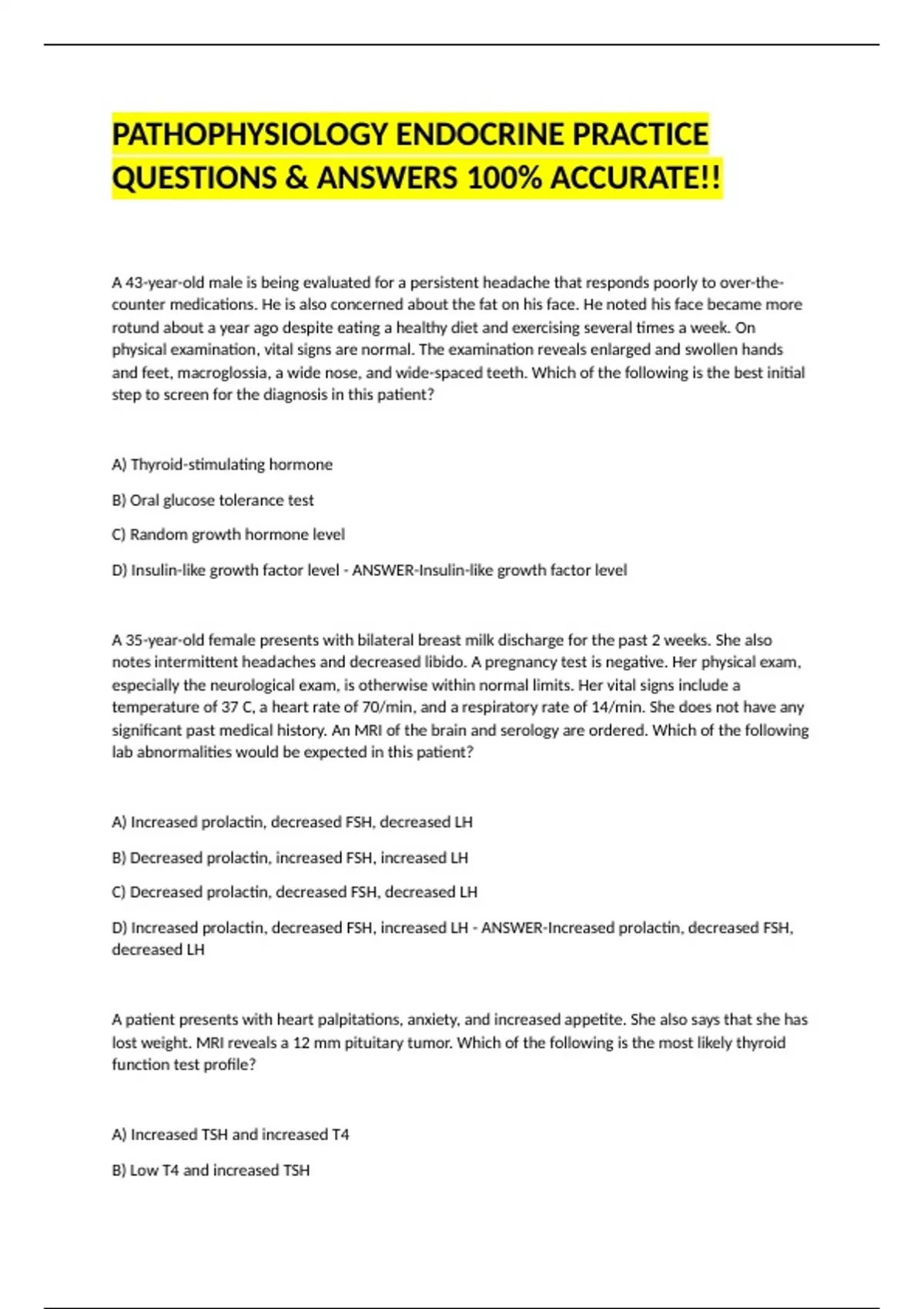 PATHOPHYSIOLOGY ENDOCRINE PRACTICE QUESTIONS & ANSWERS 100% ACCURATE!!