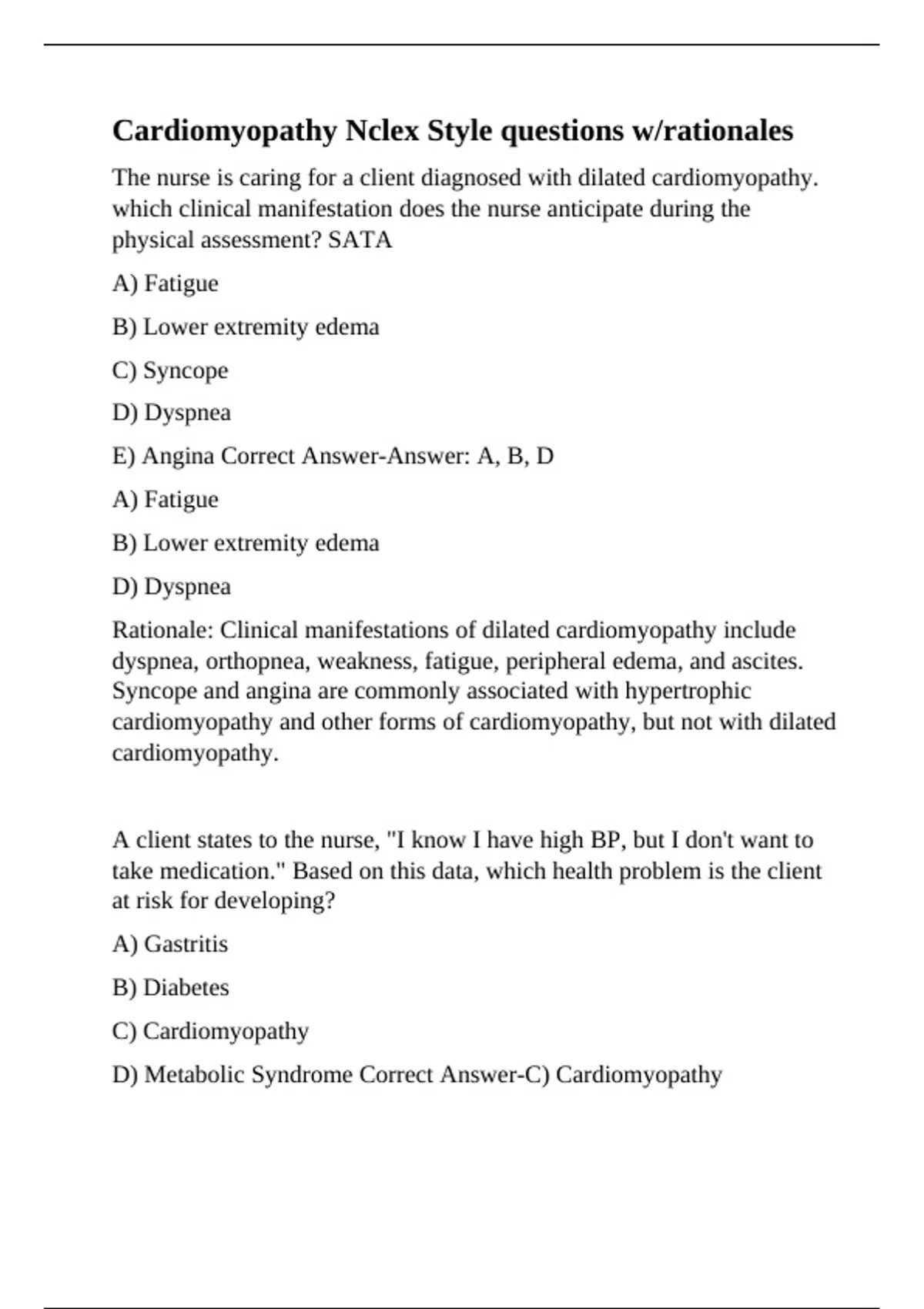 The nurse is caring for a client diagnosed with dilated cardiomyopathy. which clinical manifestation does the nurse anticipate during the physical assessment? SATA A) Fatigue B) Lower extremity edema C) Syncope D) Dyspnea E) Angina Correct Answer-Answer: A, B, D A) Fatigue B) Lower extremity edema D) Dyspnea Rationale: Clinical manifestations of dilated cardiomyopathy include dyspnea, orthopnea, weakness, fatigue, peripheral edema, and ascites. Syncope and angina are commonly associated with hypertrophic cardiomyopathy and other forms of cardiomyopathy, but not with dilated cardiomyopathy. A client states to the nurse, "I know I have high BP, but I don't want to take medication." Based on this data, which health problem is the client at risk for developing? A) Gastritis B) Diabetes C) Cardiomyopathy D) Metabolic Syndrome Correct Answer-C) Cardiomyopathy Rationale: Hypertension places the client at risk for development of cardiomyopathy. Hypertension has not been associated with gastritis, diabetes, or metabolic syndrom