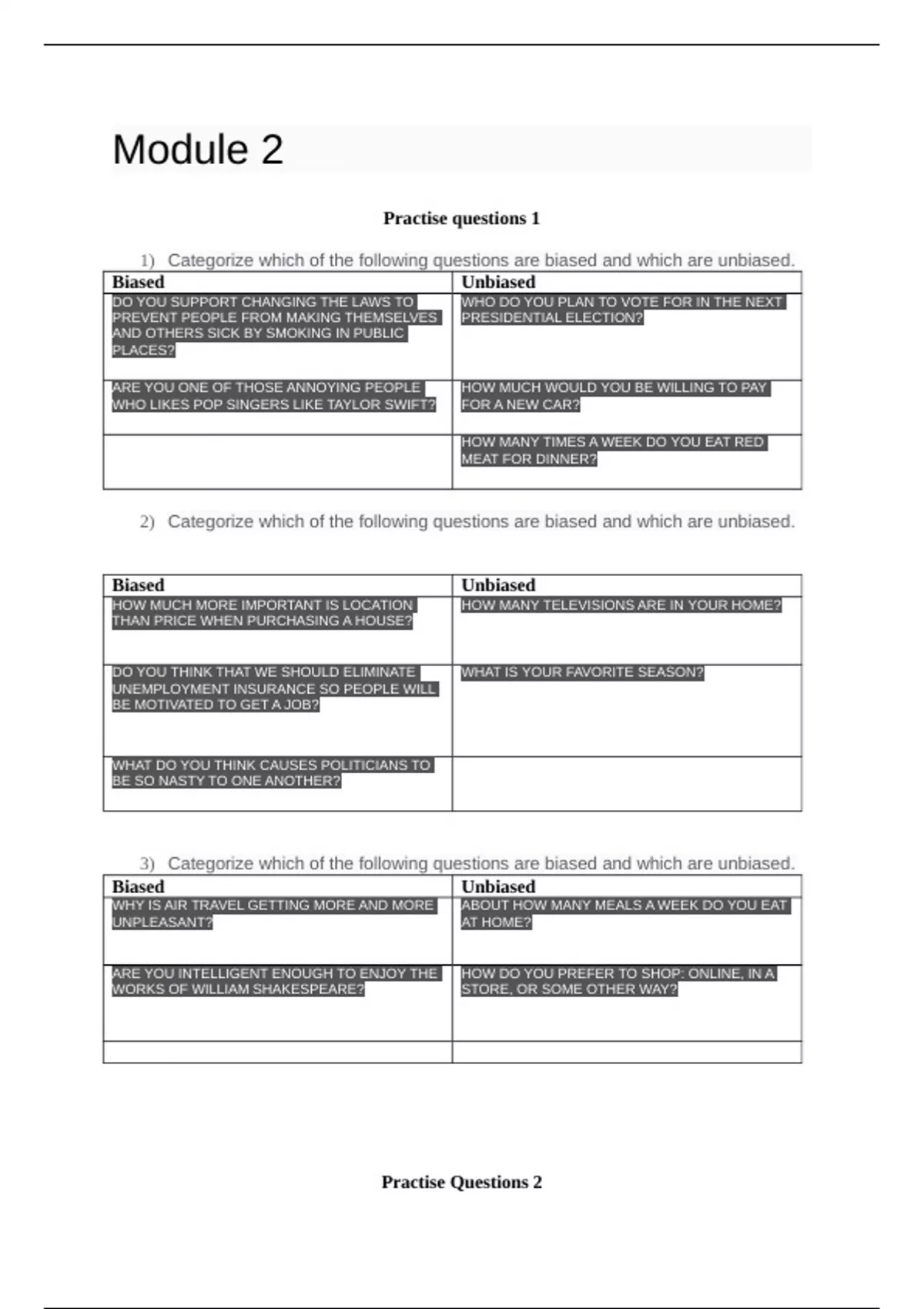 2) Categorize which of the following questions are biased and which are unbiased.
