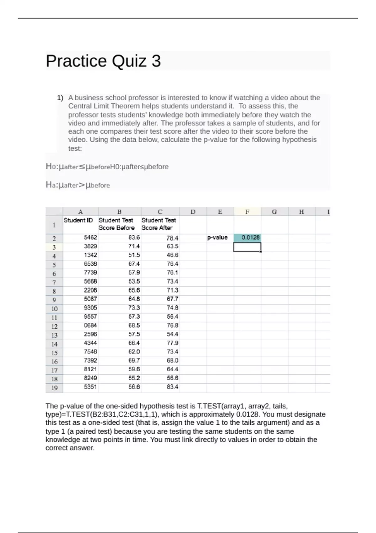 type)=T.TEST(B2:B31,C2:C31,1,1), which is approximately 0.0128. You must designate