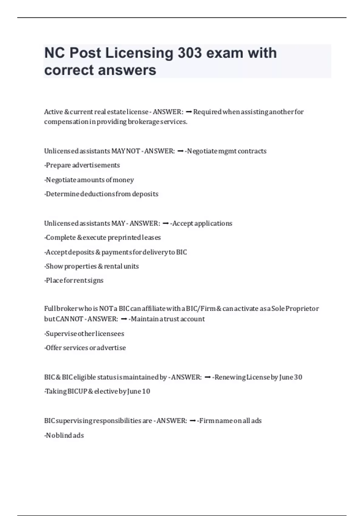NC Post Licensing 303 exam with correct answers