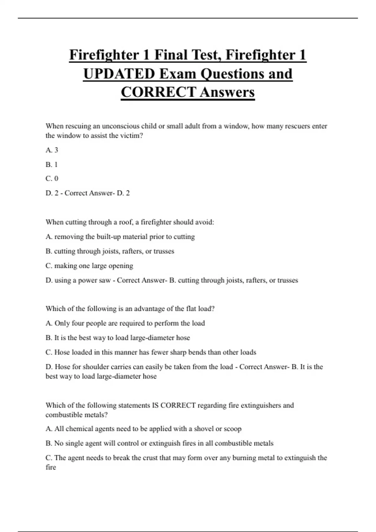 Firefighter 1 Final Test, Firefighter 1 UPDATED Exam Questions and CORRECT Answers When rescuing an unconscious child or small adult from a window, how many rescuers enter the window to assist the victim? A. 3 B. 1 C. 0 D. 2 - Correct Answer- D. 2 When cutting through a roof, a firefighter should avoid: A. removing the built-up material prior to cutting B. cutting through joists, rafters, or trusses C. making one large opening D. using a power saw - Correct Answer- B. cutting through joists, rafters, or trusses