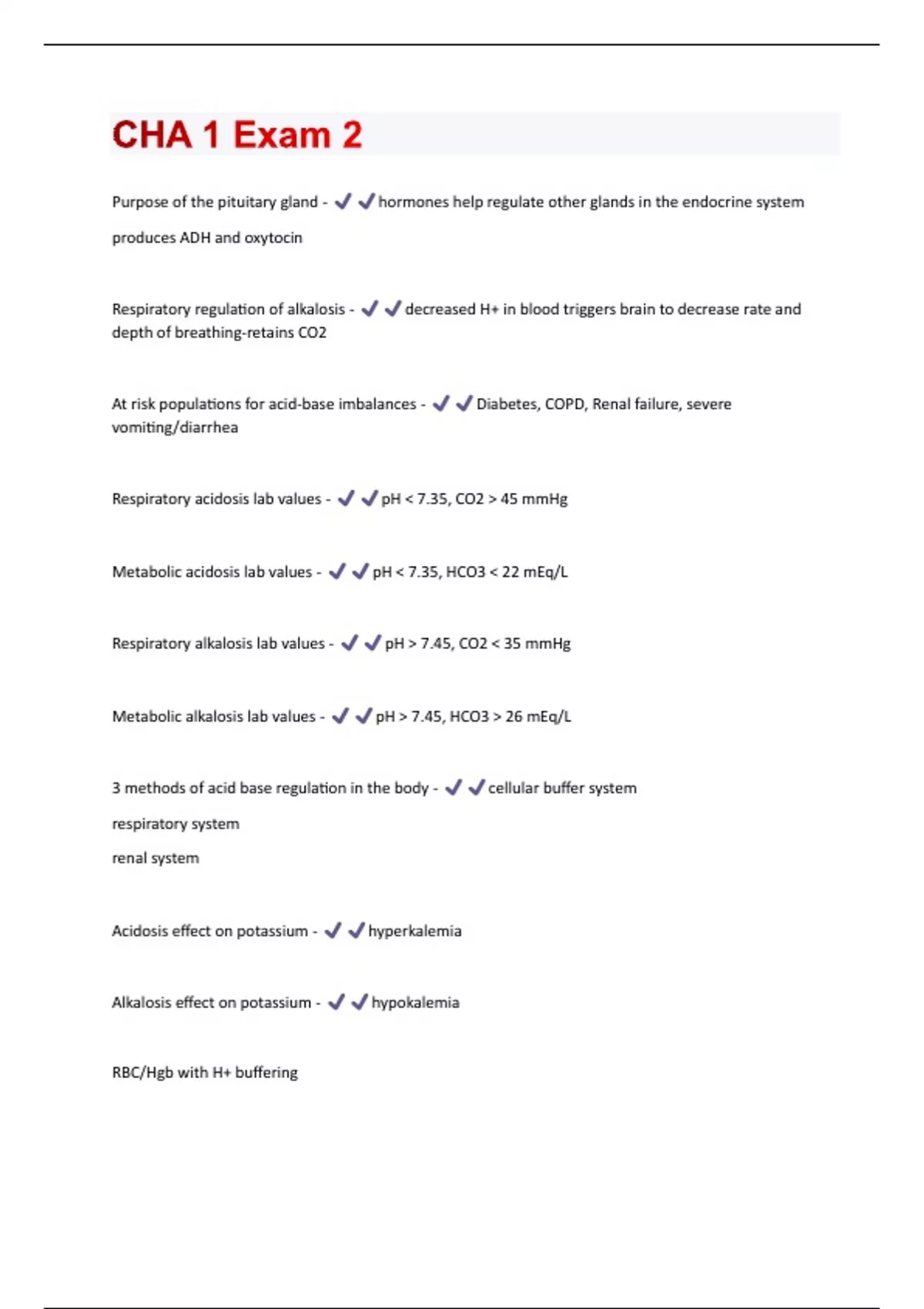 Purpose of the pituitary gland - hormones help regulate other glands in the endocrine system produces ADH and oxytocin Respiratory regulation of alkalosis - decreased H+ in blood triggers brain to decrease rate and depth of breathing-retains CO2 At risk populations for acid-base imbalances - Diabetes, COPD, Renal failure, severe vomiting/diarrhea Respiratory acidosis lab values - pH < 7.35, CO2 > 45 mmHg Metabolic acidosis lab values - pH < 7.35, HCO3 < 22 mEq/L Respiratory alkalosis lab values - pH > 7.45, CO2 < 35 mmHg Metabolic alkalosis lab values - pH > 7.45, HCO3 > 26 mEq/L 3 methods of acid base regulation in the body - cellular buffer system respiratory system renal system Acidosis effect on potassium - hyperkalemia Alkalosis effect on potassium - hypokalemia RBC/Hgb with H+ buffering(LOOK UP) - too many H+ in blood->excess H+ cross into RBC and bind to Hgb resulting in less H+ in blood->K+ leaves cell(hyperkalemia) vice-versa in alkalosis->K+ must enter cell(hypokalemia) Respiratory regulation of acidosis - increased H+ in blood triggers brain to increase rate and depth-"blows off" excess CO2, Kussmaul breathing Renal regulation of acidosis - kidneys reabsorb as well as create more HCO3, while excreting H+ Renal regulation of alkalosis - kidneys excrete HCO3 and reabsorb H+ pH range - 7.35-7.45 PaCO2 range - 35-45 HCO3 range - 22-26 Patients at risk for respiratory acidosis - respiratory depression anesthesia opioids airway obstruction COPD Patients at risk for metabolic acidosis - DKA kidney failure diarrhea excessive alcohol or ASAPatients at risk for respiratory alkalosis - hyperventilation panic attack mechanical ventilation Patients at risk for metabolic alkalosis - prolonged vomiting NG suctioning diuretics TPN antacids First sign of acidosis - confusion/lethargy(d/t CNS depression) Interventions for respiratory acidosis - maintain airway, breathing status hourly, bronchodilators, O2 sats Interventions for metabolic acidosis - treat cause(insulin if DKA), IV hydration, IV bicarb if low Interventions for alkalosis - treat cause(stop diuretics if caused by that, antiemetics if vomiting) Patient safety Purpose of adrenal glands - secrete Aldosterone, cortisol, and catecholamines Purpose of pancreas - secretion of digestive enzymes and regulates blood sugars Purpose of parathyroid glands - secrete PTH-regulates calcium and phosphorus Purpose of thyroid gland - controls metabolismPurpose of hypothalamus - sends regulatory hormones to pituitary