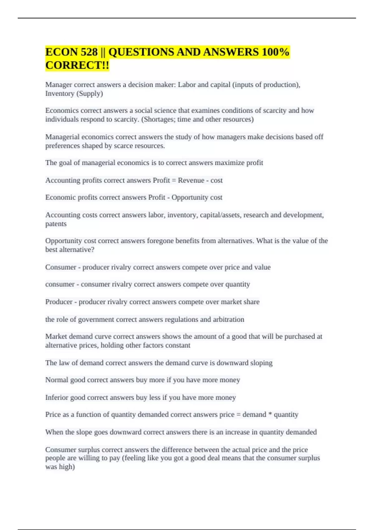 Managerial economics correct answers the study of how managers make decisions based off
