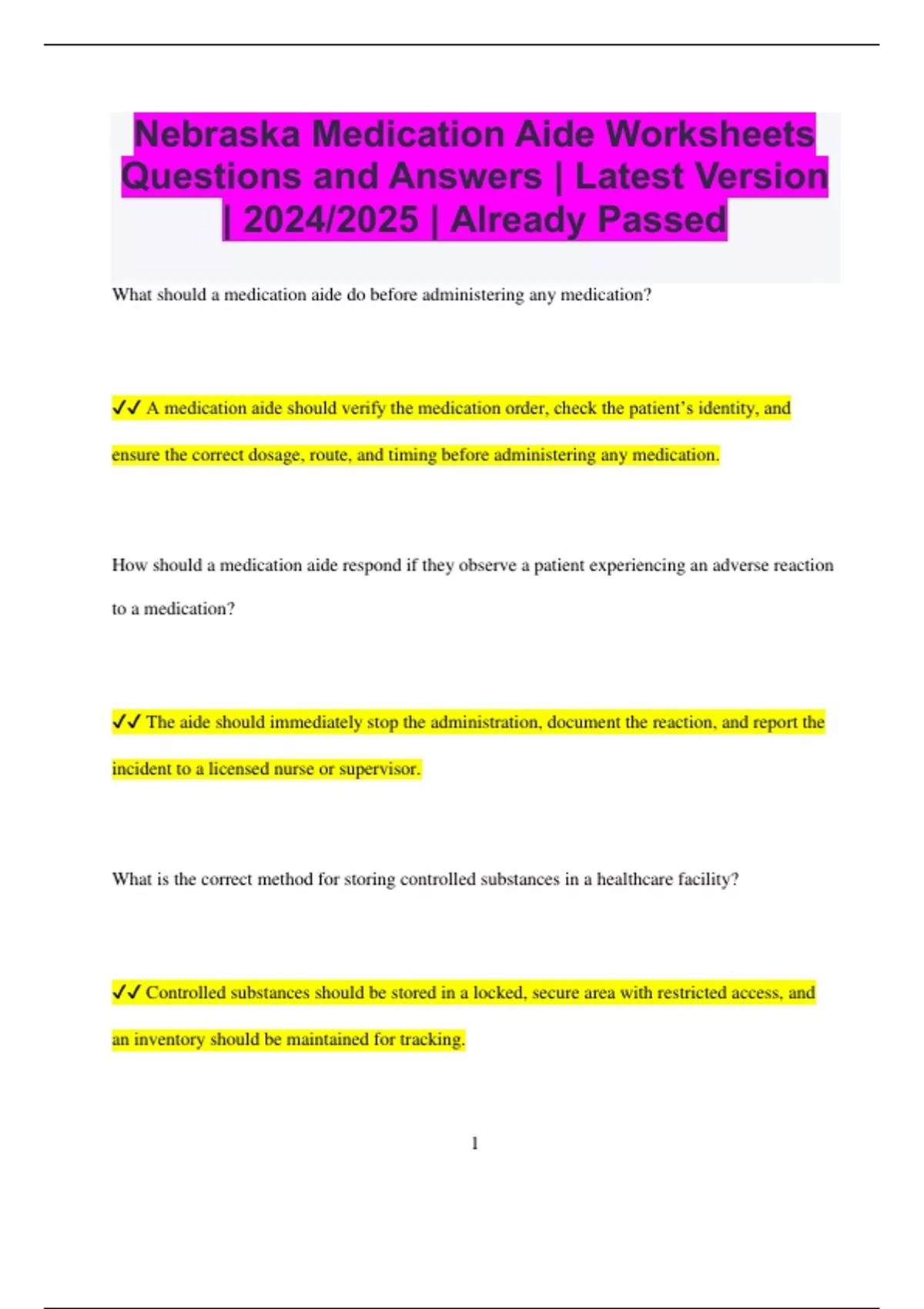✔✔ A medication aide should verify the medication order, check the patient’s identity, and