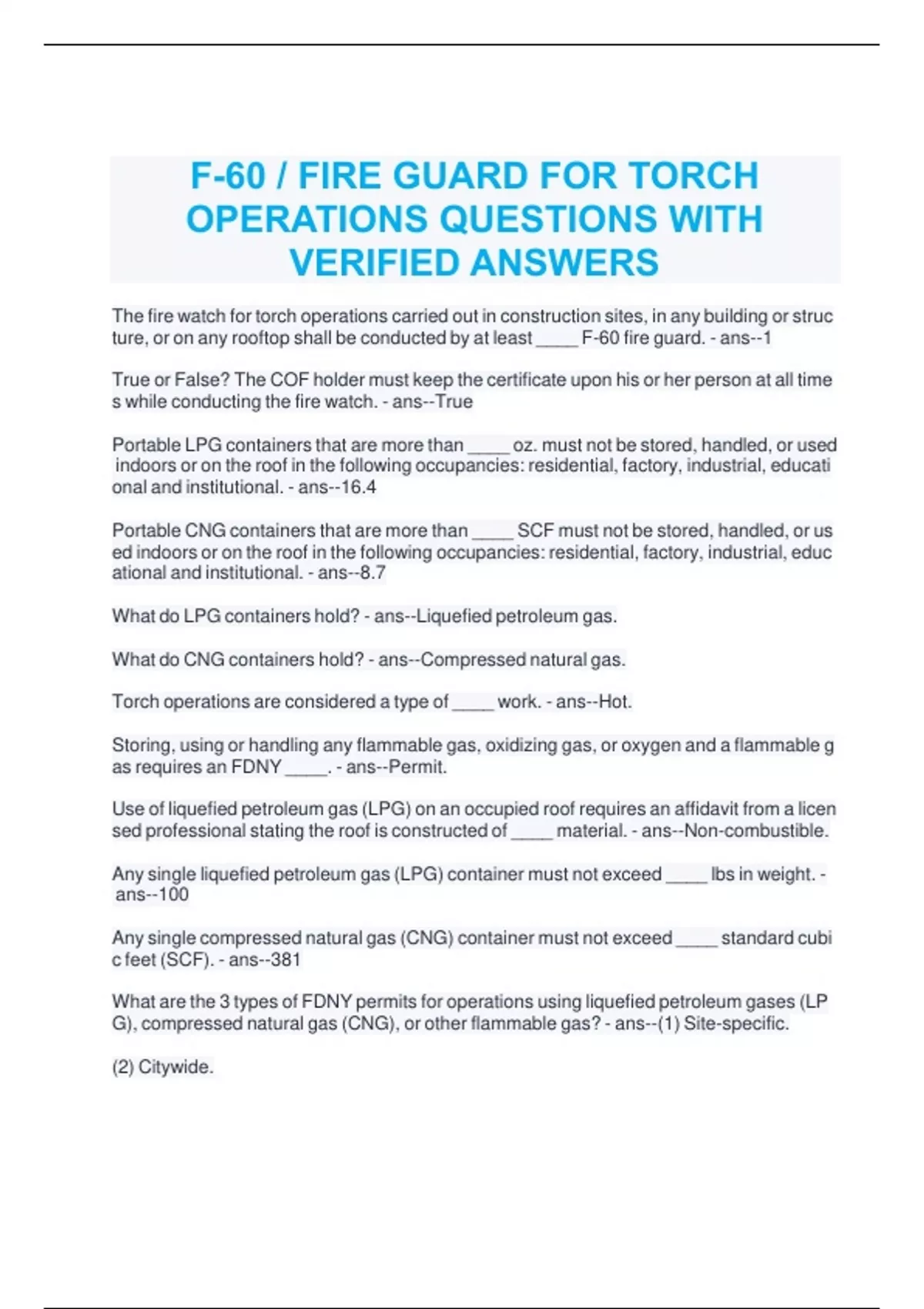 F-60 / FIRE GUARD FOR TORCH OPERATIONS QUESTIONS WITH VERIFIED ANSWERS