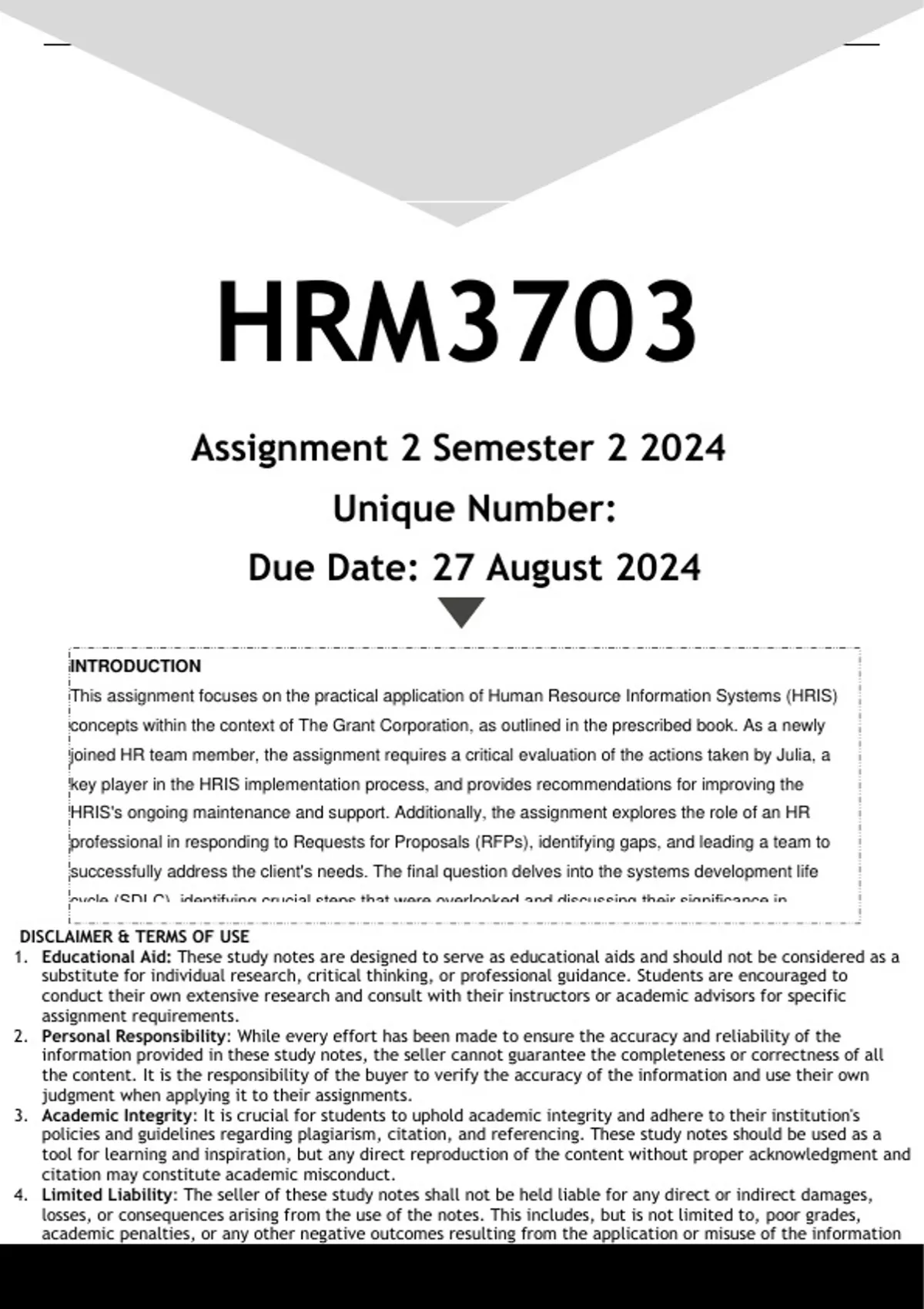 Well-structured HRM3703 Assignment 2 (ANSWERS) Semester 2 2024 - DISTINCTION GUARANTEED. (DETAILED ANSWERS - DISTINCTION GUARANTEED!)... Question 1 Read the case study at the end of chapter 5 in your prescribed book (5th edition). Then answer the questions below. Imagine that you have just joined The Grant Corporation as part of the HR team. Answer each of the questions below. (a) What did Julia do right in general? Is there anything that she should have done differently? (5 marks) (b) Were the correct people involved in the process? Who would you also have included? Provide reasons for your choices. (3 marks) (c) Advise Julia on what to include in the communication plan for the HRIS implementation (½ marks are allocated). (2 marks) (d) Once the HRIS has been implemented it is important that roles and responsibilities are clarified in terms of continued maintenance of the HRIS within the HR Department. Propose four additional broad steps that the HR department at The Grant Corporation should take to ensure that the new system will be properly maintained and supported after implementation. (4 marks) [14] Question 2 You have been working in HR for several years. You decide to make a career move and you apply for a vacancy at a leading HRIS vendor. You get the job and join the team working with requests for proposals (RFPs). One of the first tasks that you need to complete is help your team to respond to an RFP that The Grant Corporation (see question 1) published when they required a new HRIS. The Grant corporation provides an RFP document that includes the following: The name of the company, the industry, the number of employees, their turnover, a description about the company structure and geographical locations. They furthermore included a detailed description of the technical requirements of their desired HRIS. (a) You look at the RFP received, identify gaps in the RFP that you would have to approach The Grant Corporation about to gather the required information so that your company would be able to prepare a proper response to their RFP (½ marks are allocated). (2 marks) (b) Your employer expects you to lead your team in preparing a proper response to The Grant Corporation’s RFP. Use what you have learned in this module in Lesson 04 to suggest the correct steps to follow for your team to respond to the RFP of The Grant Corporation to increase your company’s chances of success (½ marks are allocated). (8 marks) [10] Question 3 Refer to The Grant Corporation in question 1. Keeping what you have learned in Chapter 3 regarding the systems development life cycle in mind identify the main mistake that Julia Woodland made. Identify the one crucial step in the SDLC that Julia did not pay attention to. In your discussion focus on why this step is important and what the main purpose of this step is. (6 marks)