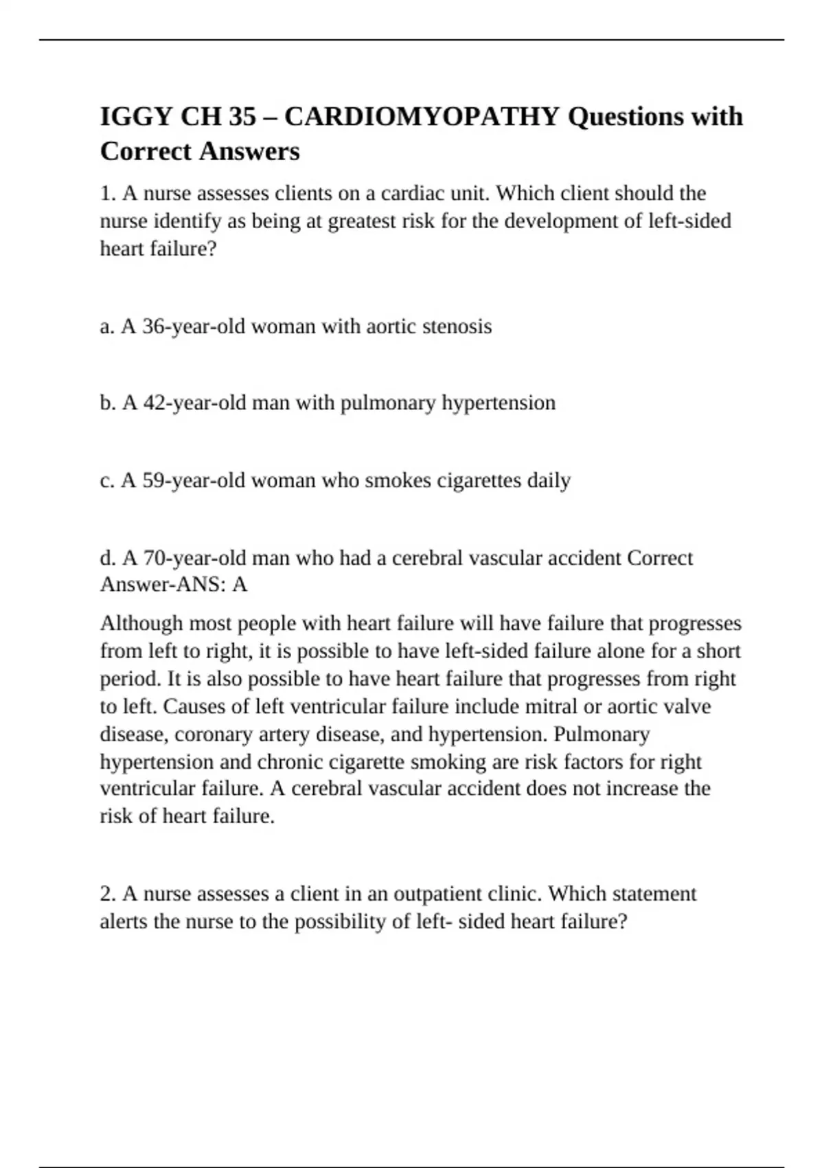 1. A nurse assesses clients on a cardiac unit. Which client should the nurse identify as being at greatest risk for the development of left-sided heart failure? a. A 36-year-old woman with aortic stenosis b. A 42-year-old man with pulmonary hypertension c. A 59-year-old woman who smokes cigarettes daily d. A 70-year-old man who had a cerebral vascular accident Correct Answer-ANS: A Although most people with heart failure will have failure that progresses from left to right, it is possible to have left-sided failure alone for a short period. It is also possible to have heart failure that progresses from right to left. Causes of left ventricular failure include mitral or aortic valve disease, coronary artery disease, and hypertension. Pulmonary hypertension and chronic cigarette smoking are risk factors for right ventricular failure. A cerebral vascular accident does not increase the risk of heart failure. 2. A nurse assesses a clien