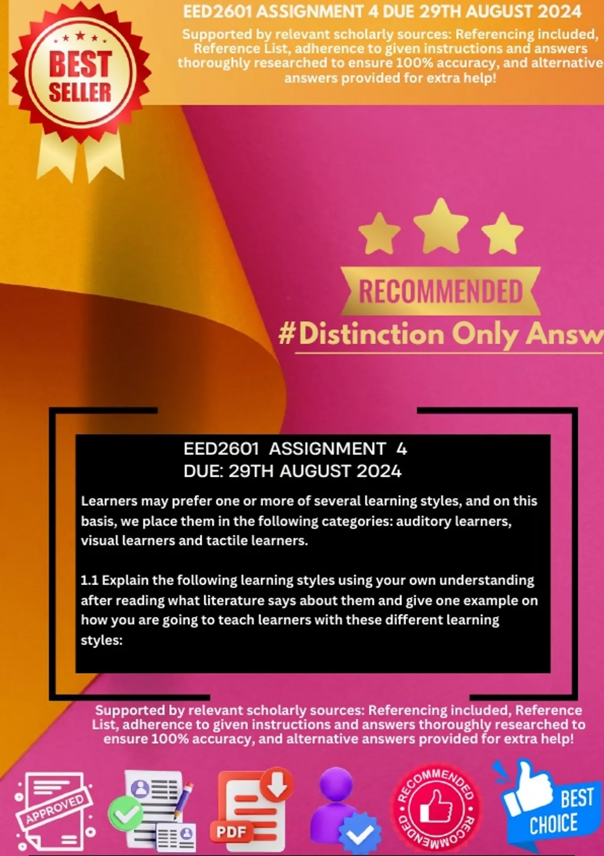 EED2601 Assignment 4 (29th August 2024) - Detailed and accurate (Get that DISTINCTION) Buy Quality Work! Learners may prefer one or more of several learning styles, and on this basis, we place them in the following categories: auditory learners, visual learners and tactile learners. 1.1 Explain the following learning styles using your own understanding after reading what literature says about them and give one example on how you are going to teach learners with these different learning styles: