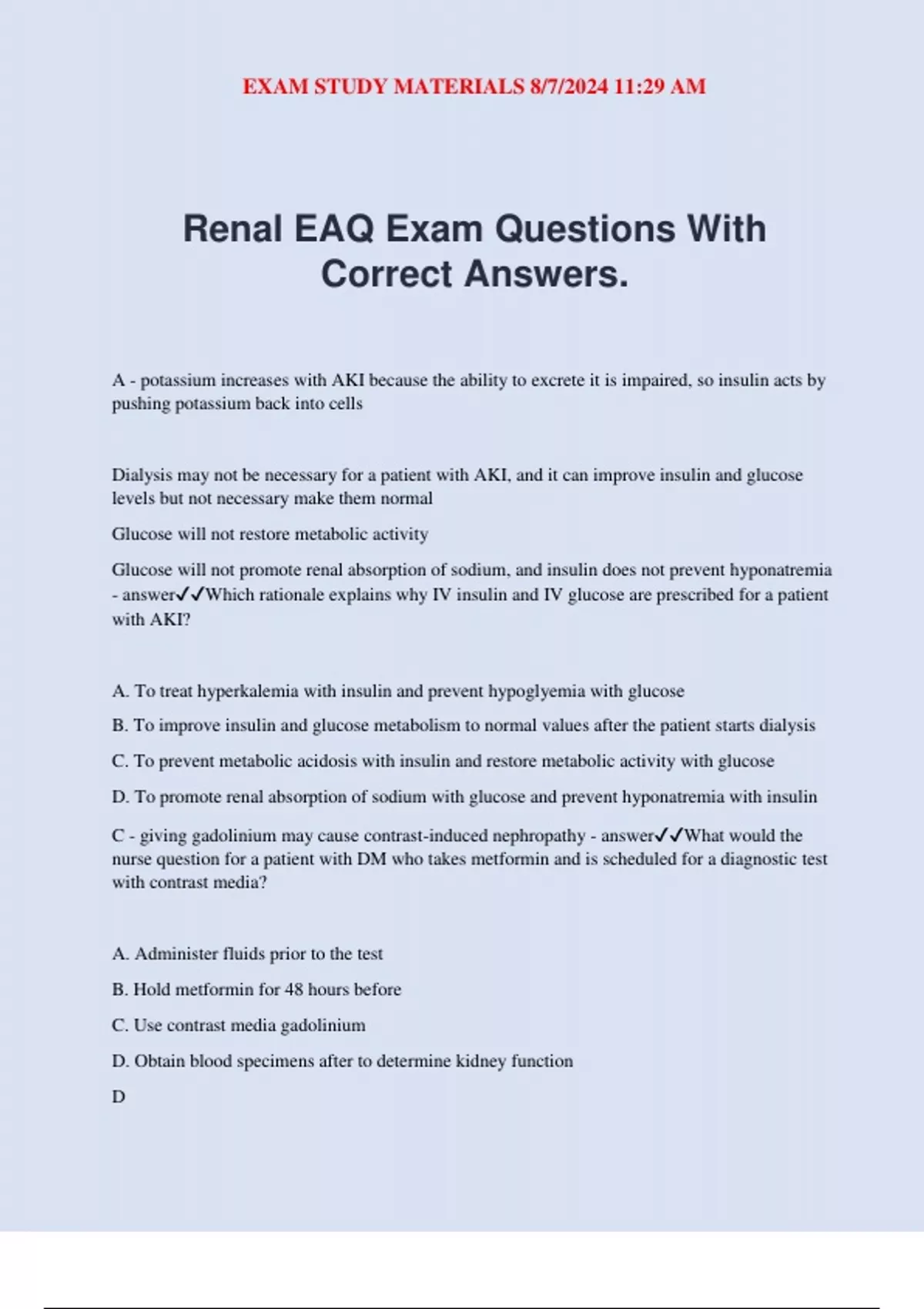 Renal EAQ Exam Questions With Correct Answers. A - potassium increases with AKI because the ability to excrete it is impaired, so insulin acts by pushing potassium back into cells Dialysis may not be necessary for a patient with AKI, and it can improve insulin and glucose levels but not necessary make them normal Glucose will not restore metabolic activity Glucose will not promote renal absorption of sodium, and insulin does not prevent hyponatremia - answerWhich rationale explains why IV insulin and IV glucose are prescribed for a patient with AKI? A. To treat hyperkalemia with insulin and prevent hypoglyemia with glucose B. To improve insulin and glucose metabolism to normal values after the patient starts dialysis C. To prevent metabolic acidosis with insulin and restore metabolic activity with glucose D. To promote renal absorption of sodium with glucose and prevent hyponatremia with insulin C - giving gadolinium may cause contrast-induced nephropathy - answerWhat would the nurse question for a patient with DM who takes metformin and is scheduled for a diagnostic test with contrast media? A. Administer fluids prior to the test B. Hold metformin for 48 hours before C. Use contrast media gadolinium D. Obtain blood specimens after to determine kidney function D EXAM STUDY MATERIALS 8/7/2024 11:29 AM The patient should be weighed once a day A patient with AKI will have fluid excess and Na/K retention, so they should be restricted Adequate, not low protein should be given - answerThe nurse will make which intervention when caring for a patient during the oliguric phase of AKI? A. Weight the patient three times in a week B. Increase dietary Na and K C. Provide low protein and high carb foods D. Restrict fluids according to previous daily loss D - answerWhat amount of urinary output corresponds with nonoliguric AKI? A. 150 mL/day B. 250 mL/day C. 350 mL/day D. 450 mL/day C - if the medication is given to a patient with hypoactive bowel sounds, bowel necrosis can occur The other symptoms indicate hyperkalemia and are not relevant in determining if the med should be given - answerWhat finding is a priority concern regarding safe administration of sodium polystyrene sulfonate for treatment of hyperkalemia in a patient with AKI? A. Nausea B. Apical pulse of 55 C. Hypoactive bowel sounds D. Patient report of palpitations D - the graft connects the artery and vein for access for hemodialysis, when listening over the graft a bruit should be heard which means