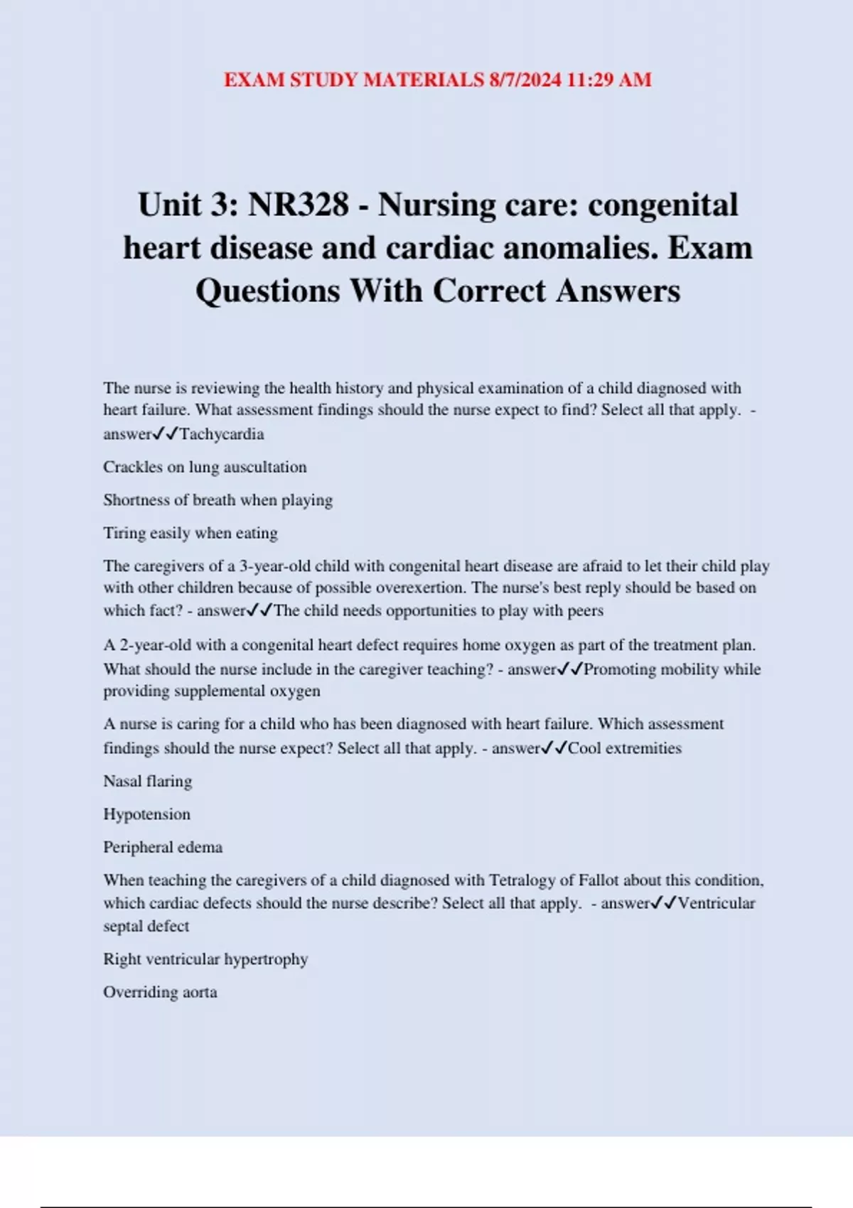 Unit 3: NR328 - Nursing care: congenital heart disease and cardiac anomalies. Exam Questions With Correct Answers